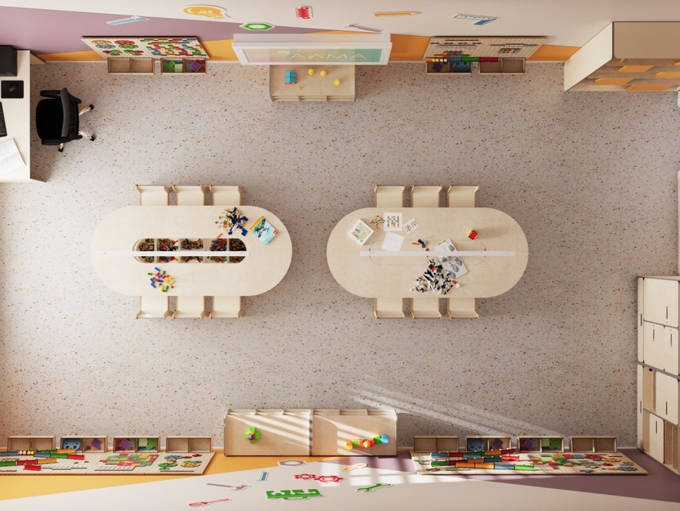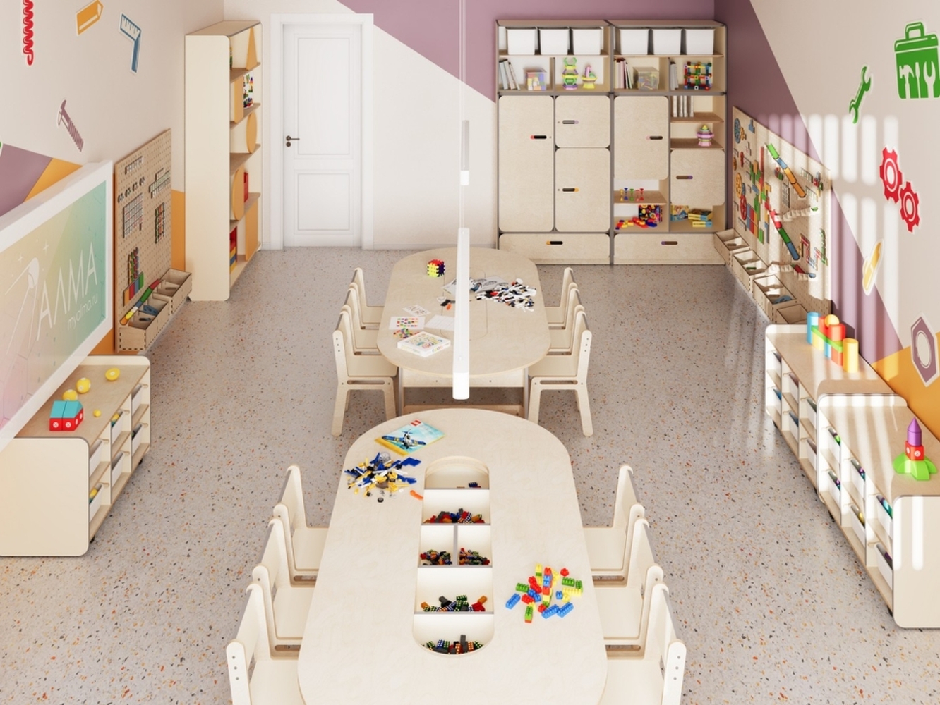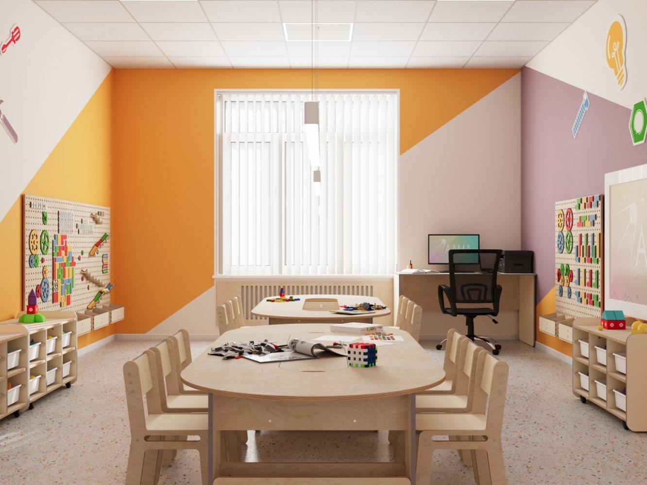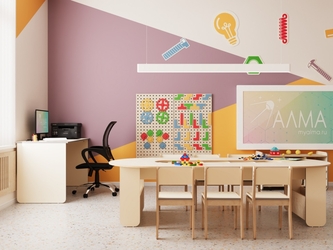 - Единое стильное оформление. Мебель и декоративные элементы выполнены в едином визуальном стиле. Это создает организованную, приятную и мотивирующую среду для обучения и творчества.
