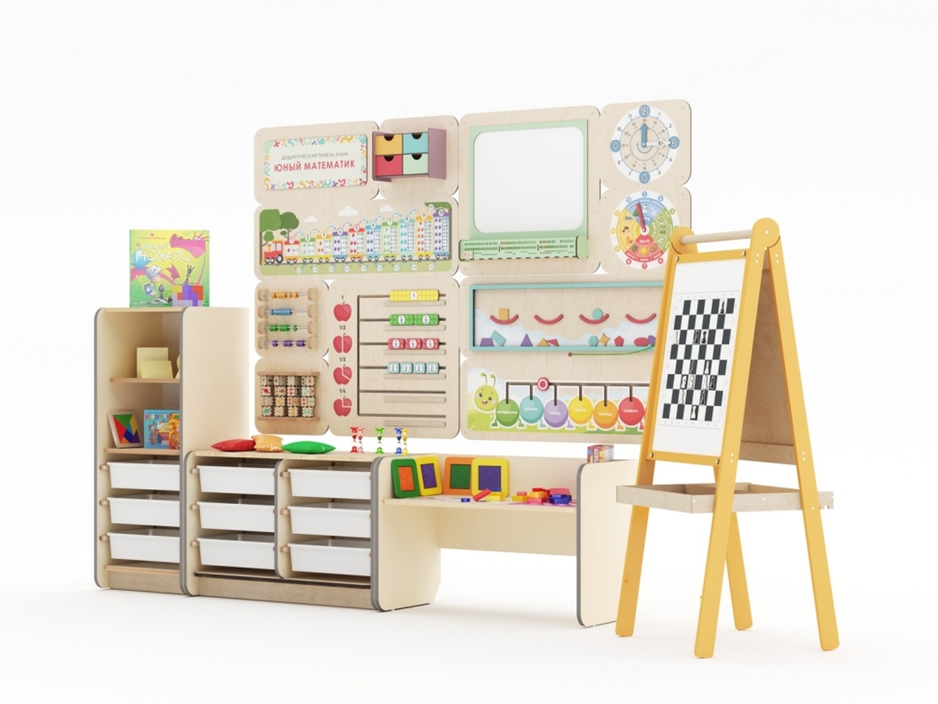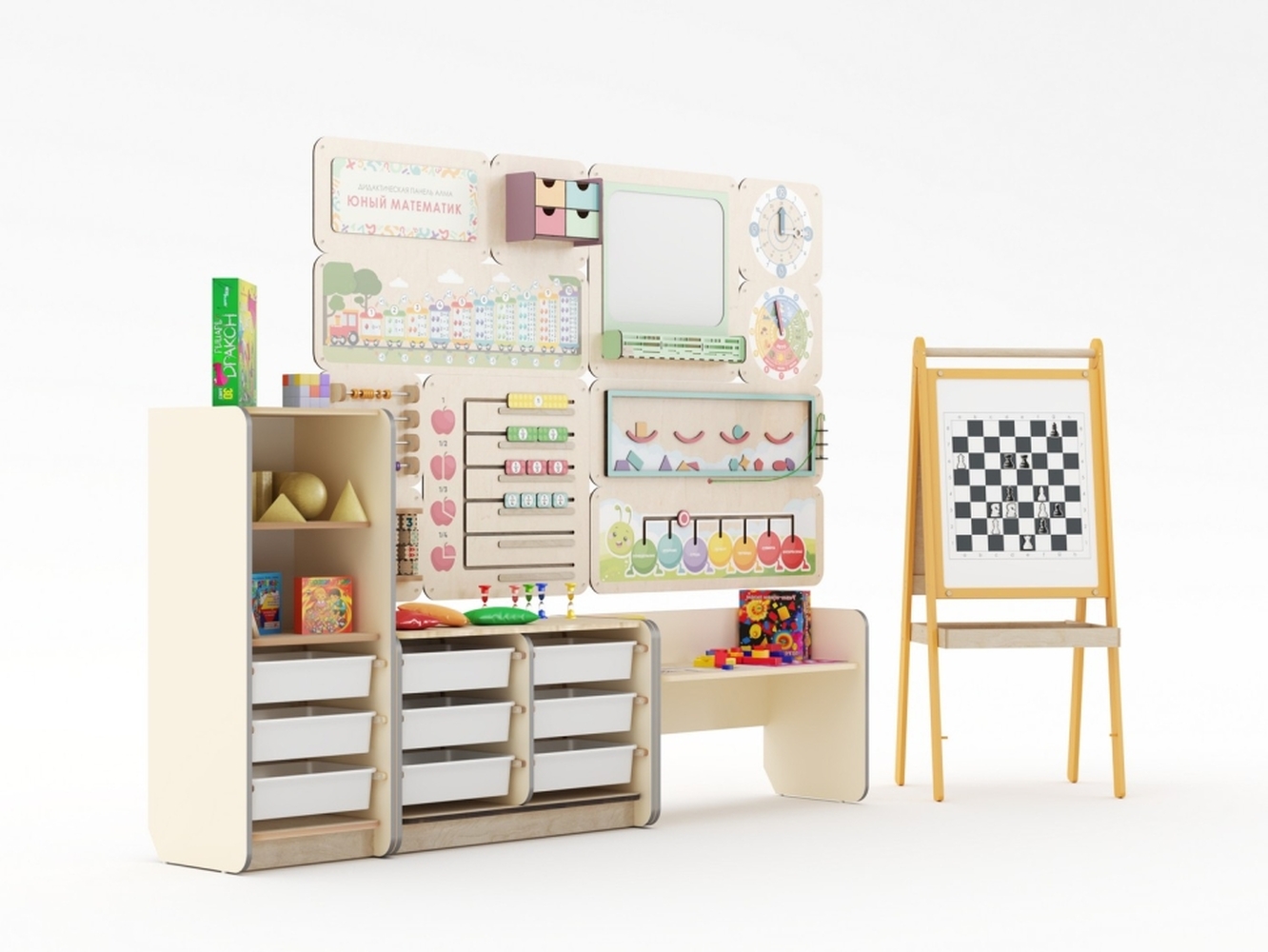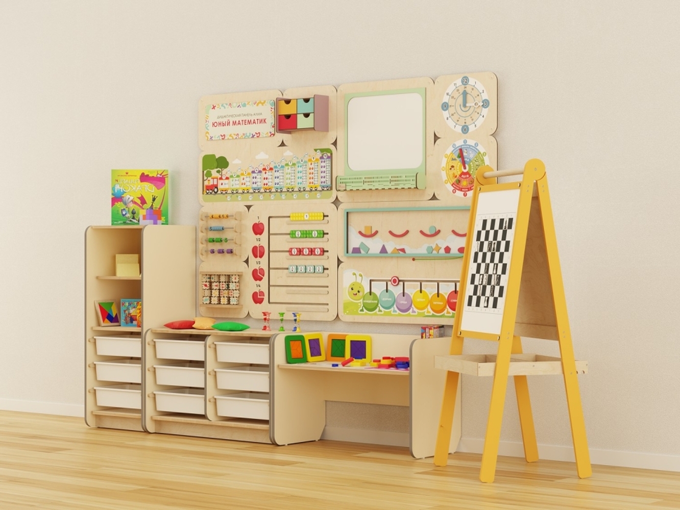 Готовый уголок математики и шахмат разработан методистами, конструкторами и дизайнерами на основе требований ФГОС. Уголок подходит для зонирования помещения в игровых зонах в детском саду, развивающем центре и другом образовательном учреждении и имеет следующие преимущества: