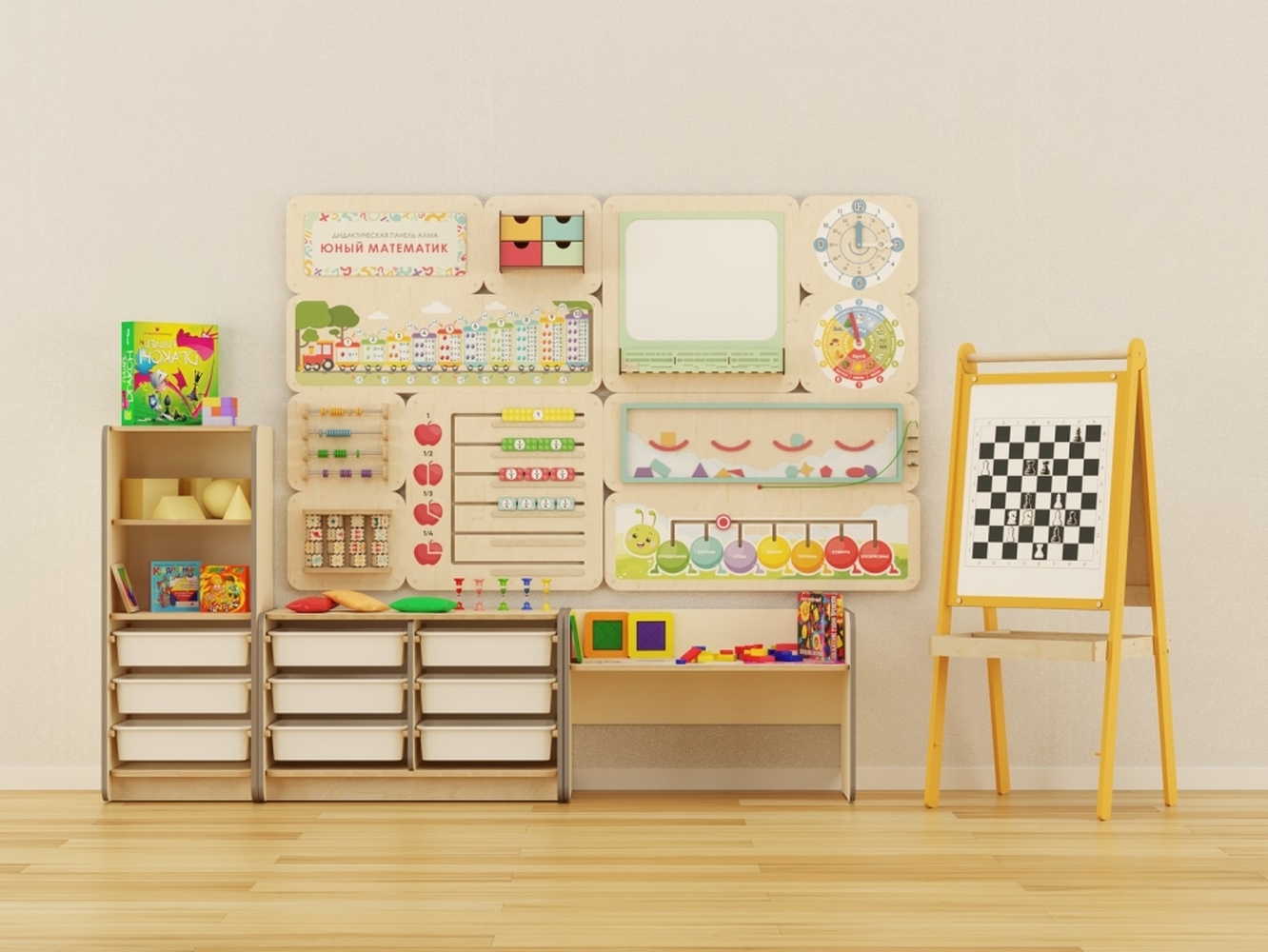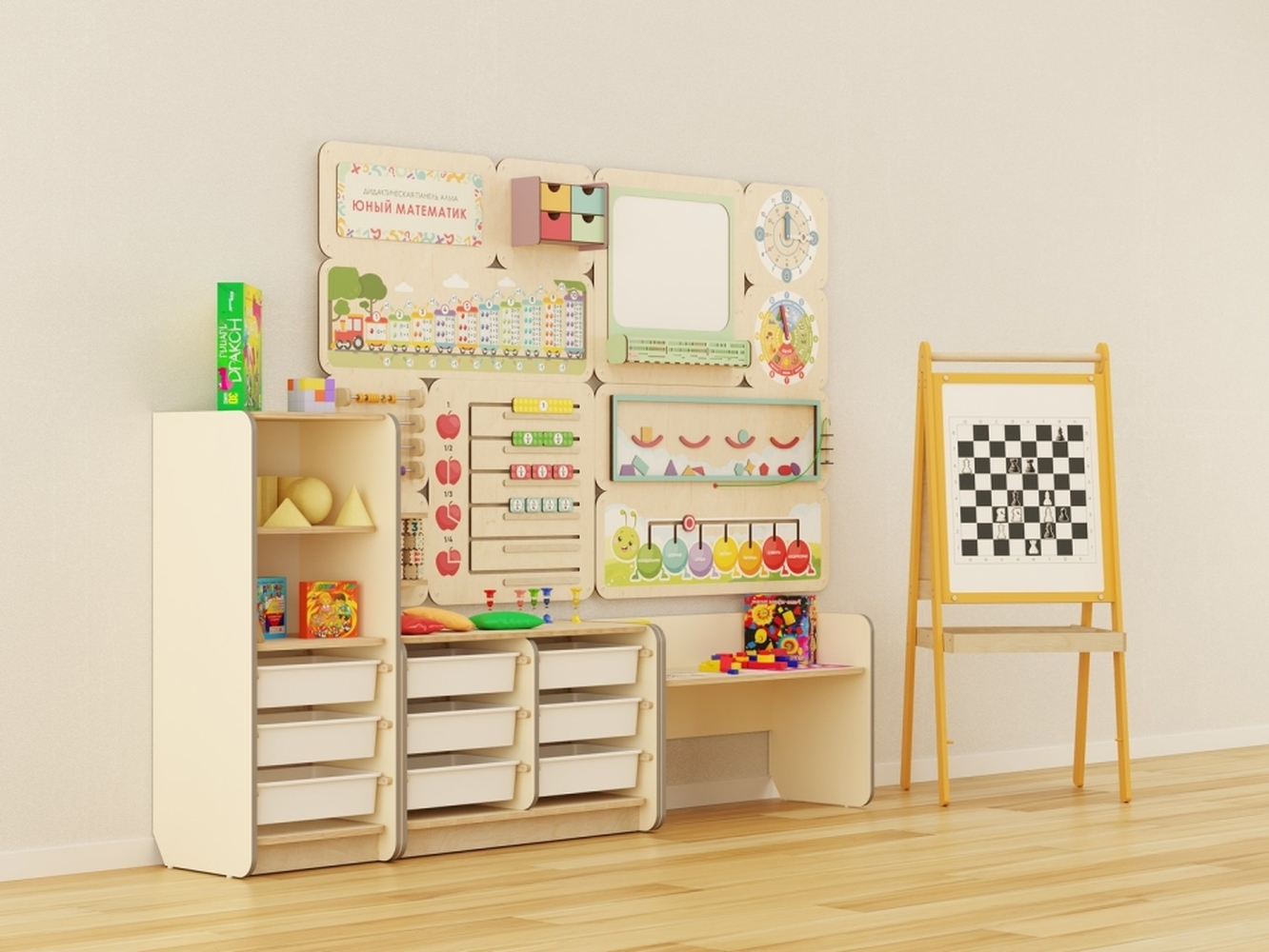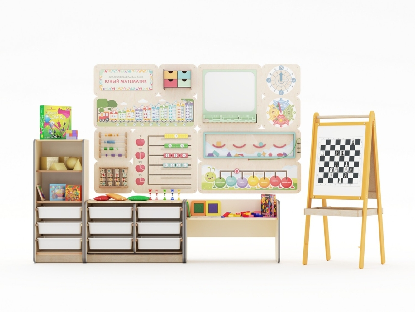 Готовый уголок математики и шахмат разработан методистами, конструкторами и дизайнерами на основе требований ФГОС. Уголок подходит для зонирования помещения в игровых зонах в детском саду, развивающем центре и другом образовательном учреждении и имеет следующие преимущества: