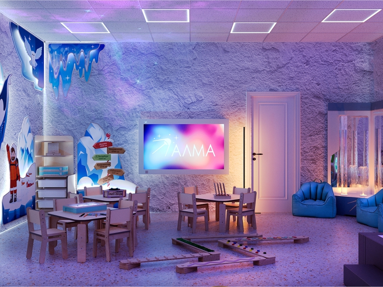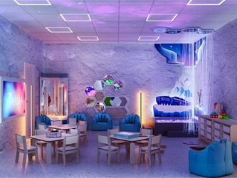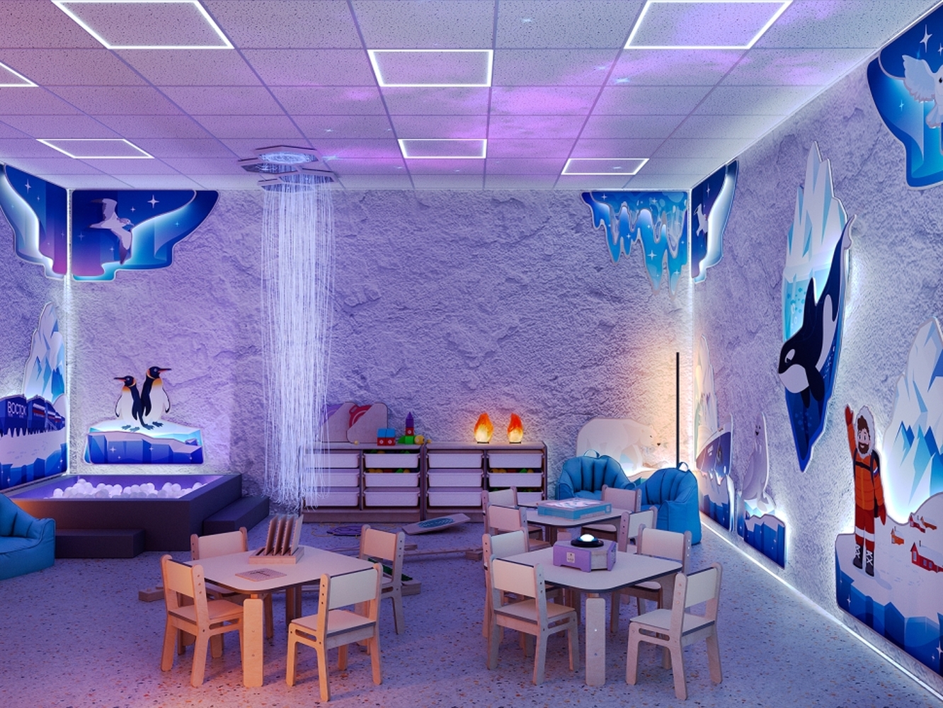 Пребывание в соляной комнате не только способствует укреплению иммунитета, но еще расслабляет и помогает снять психологическое напряжение. Этому способствует приглушенный свет, мягкие пуфы, пузырьковые колонны и другое световое оборудование, тактильные панели для сенсорного развития и фибероптические нити.