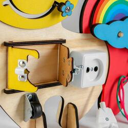Эта оригинальная доска выполнена в виде яркого единорога, который знакомит ребёнка с бытовыми предметами. Глазки сделаны из шестерёнок, рот — в виде лабиринта, на ушке серёжка — маленький выключатель светильника, а на хвосте размещены пазл-радуга и шнуровка.