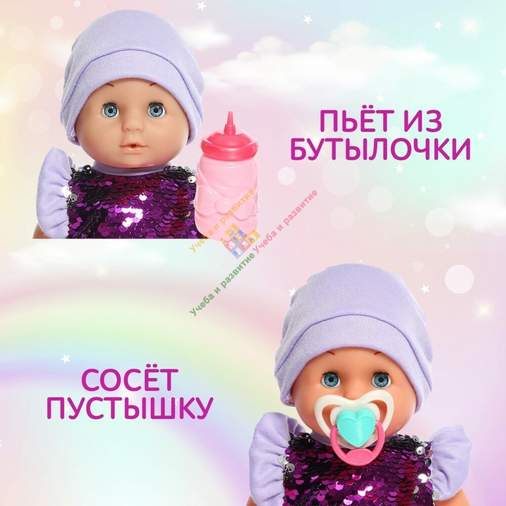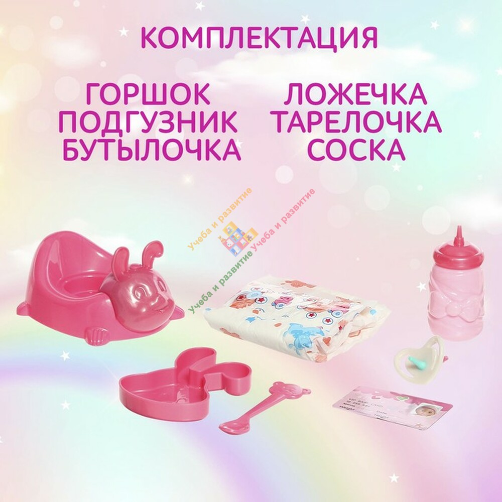 - В комплект входит соска, бутылочка, горшок, тарелочка, подгузник и ложечка. С этими аксессуарами ребёнок придумает множество весёлых игр.