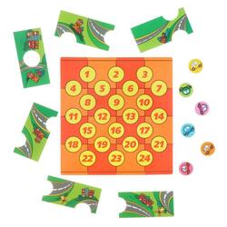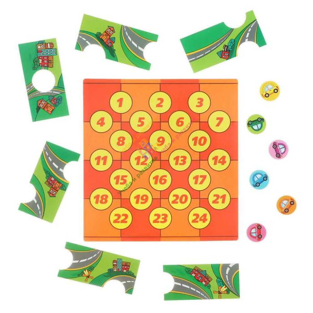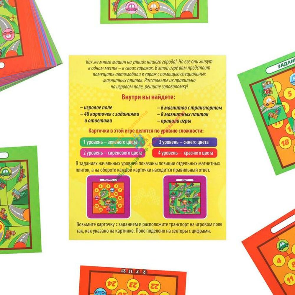 Возьмите карточку с заданием и расположите транспорт на игровом поле так, как на ней указано. В наборе восемь элементов разной формы. Ваша задача — расположить их на доске так, чтобы через отверстия были видны машины, указанные в задании. Попробуйте решить головоломку!
