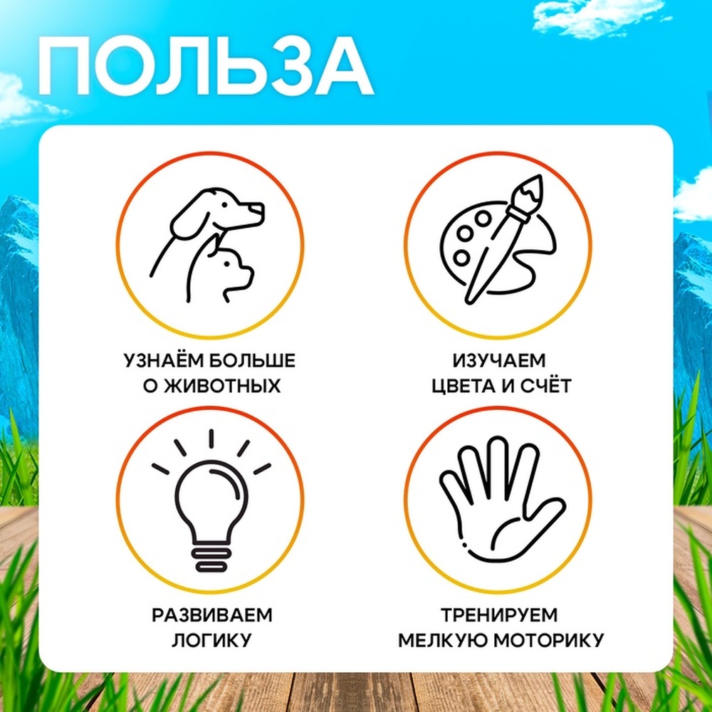 Весёлые зверята ждут вашего малыша для выполнения интересных заданий. Карточки с описанием каждого зверька помогут малышу узнать больше о мире животных.