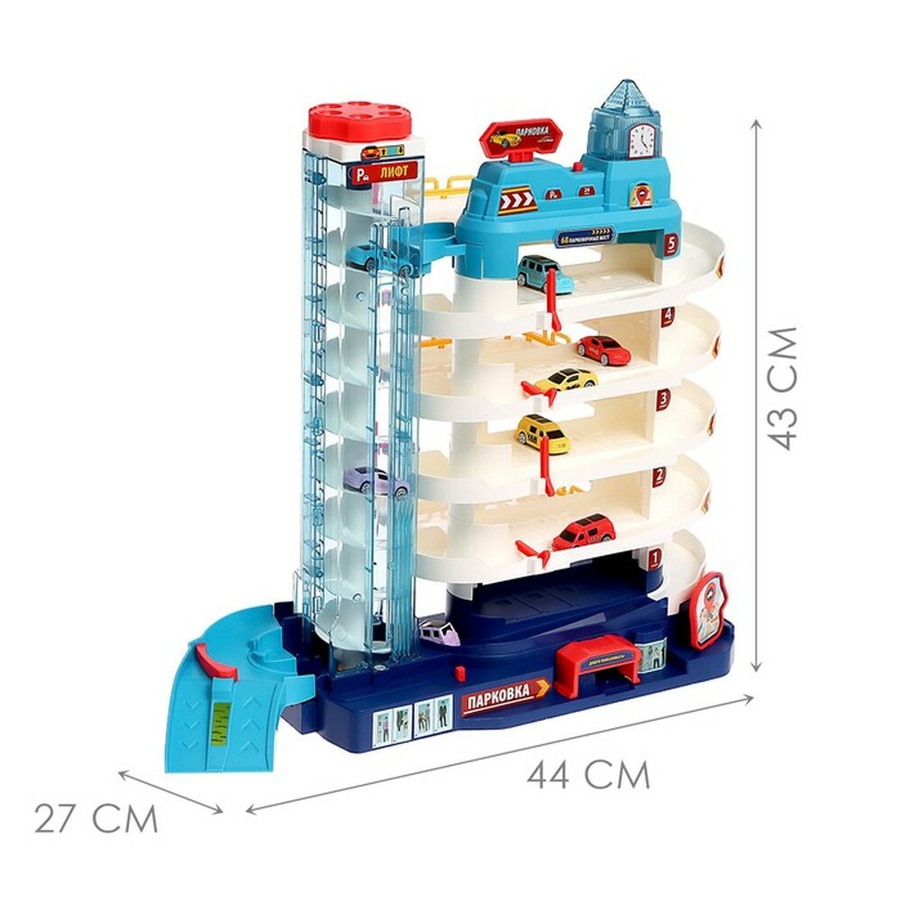 - Имеет 5 этажей, каждый вмещает до 4 машинок.