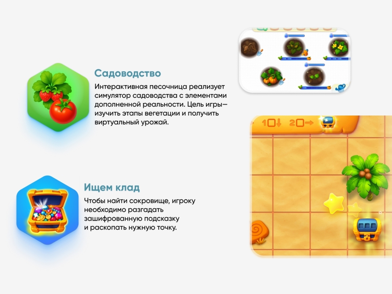 При взаимодействии с цветом, формой и текстурой дети создают разноцветные ландшафты, прокладывают маршруты для персонажей и выращивают виртуальные растения. Это развивает цветовосприятие и мелкую моторику.