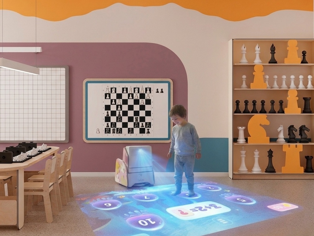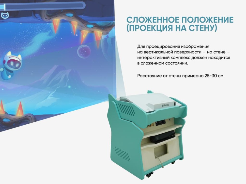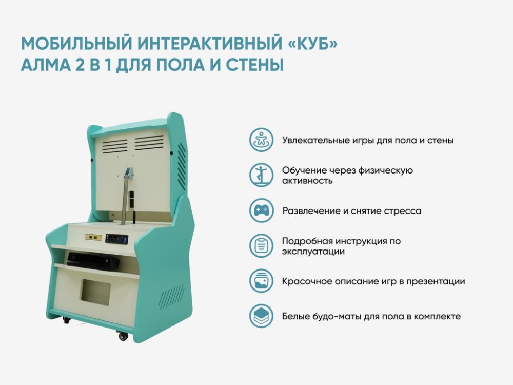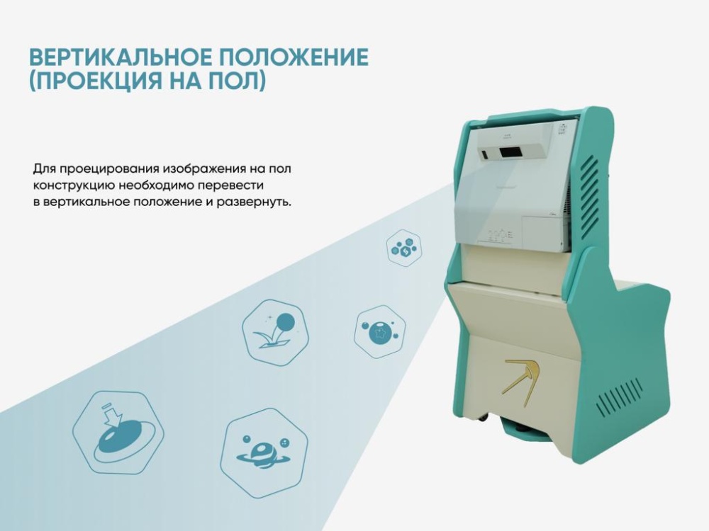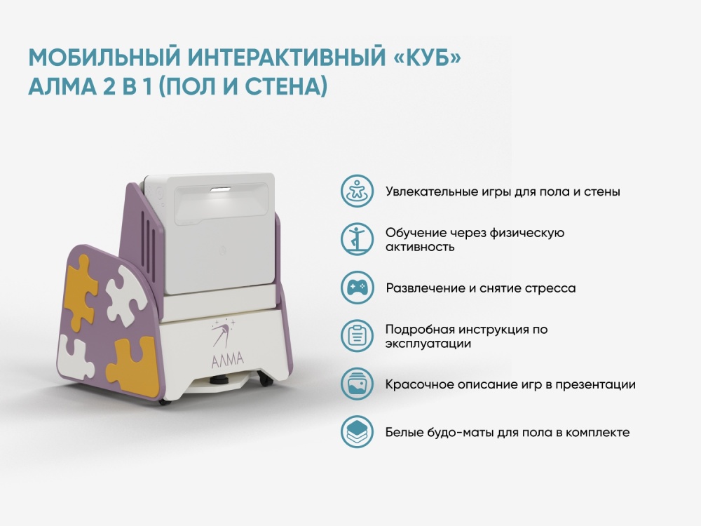 Мобильный интерактивный «КУБ» — проекционное оборудование для создания развивающего пространства на поверхностях пола или стены, которое позволяет детям играть с виртуальными объектами.