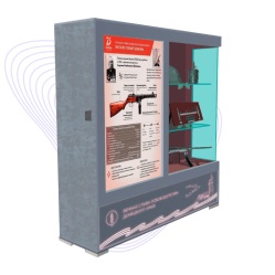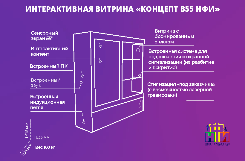 Отличительной особенностью интерактивной витрины «Концепт» 55В НФИ является индивидуальная стилизация комплекса, бронированные стекла с охранной сигнализацией и встроенная индукционная петля для слабослышащих посетителей музея.