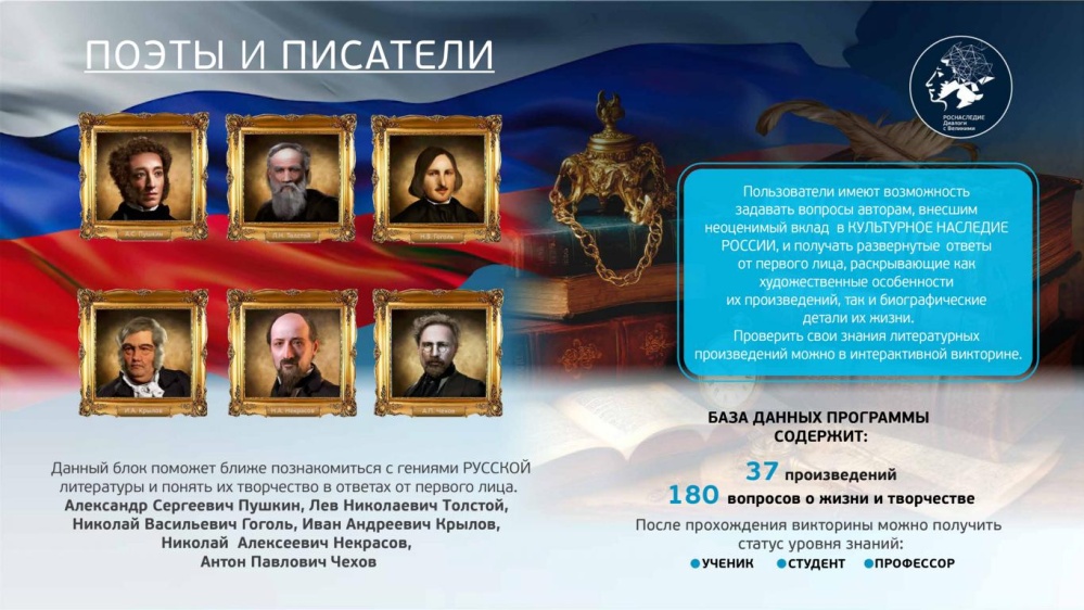 В программе "Роснаследие. Диалоги с Великими" пользователи общаются в режиме реального времени с историческими личностями, внесшими вклад в культурное и историческое наследие России. Помимо диалогов, программа включает викторины, биографию от первого лица и чтение авторами собственных произведений.