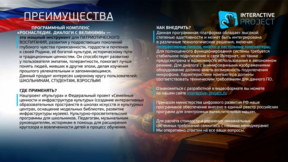 - Программа идеально работает на интерактивных панелях, столах и киосках, интегрируясь в пространство художественных галерей, школ искусств, музеев и ДК. Это современный способ увлечь подрастающее поколение наследием русских художников, сделав обучение интерактивным и запоминающимся.
