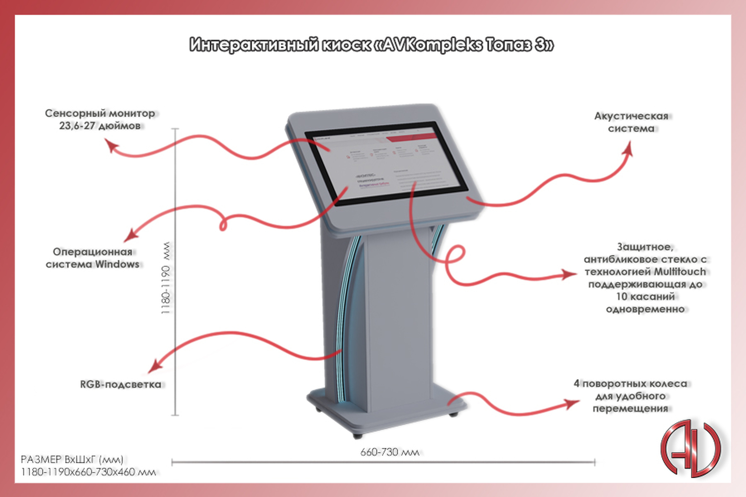 Интерактивный киоск, или как его еще называют информационный сенсорный киоск, воплощает в себе лучшие технические разработки и современное дизайнерское решение – стойка с подсветкой, на которой установлен сенсорный экран с диагональю на выбор и производительный компьютер, позволяющий получить быстрый ответ на запрос пользователя. Для использования такого оборудования не требуется специальной подготовки, его интерфейс доступен и понятен, человек взаимодействует с ПК простым прикосновением к элементам экрана, запрос тут же обрабатывается в памяти компьютера и наглядно отображает полученный результат на экране.