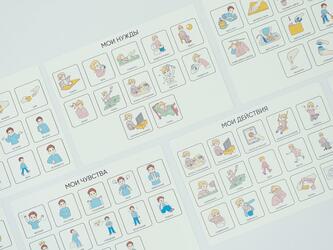 Таблица выбора: комплект листов, на которых представлены иллюстрации разных вариантов одной категории (состояние, потребности и т.п.). Ребёнку предлагают тематическую таблицу, на которой он выбирает актуальное состояние, потребность, желаемое действие. Комплект включает более 20 листов.