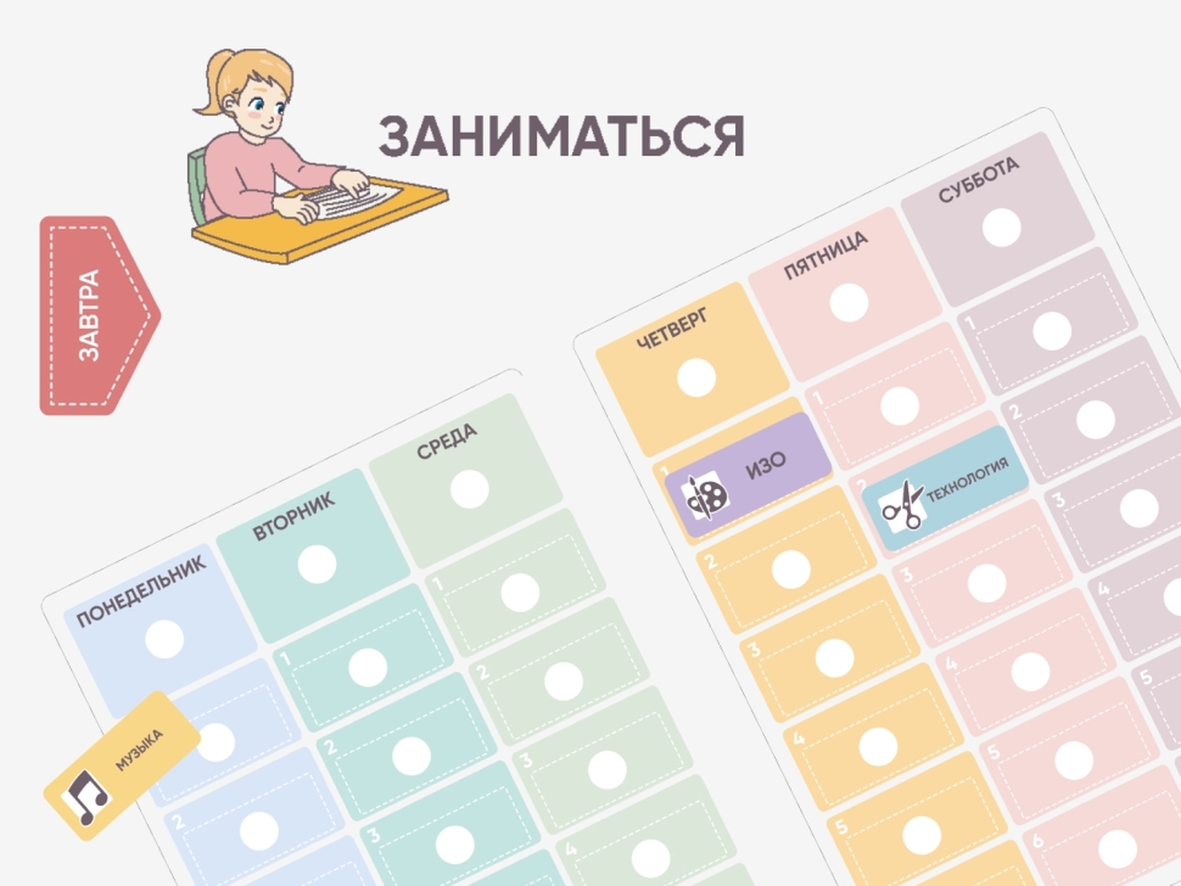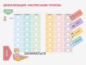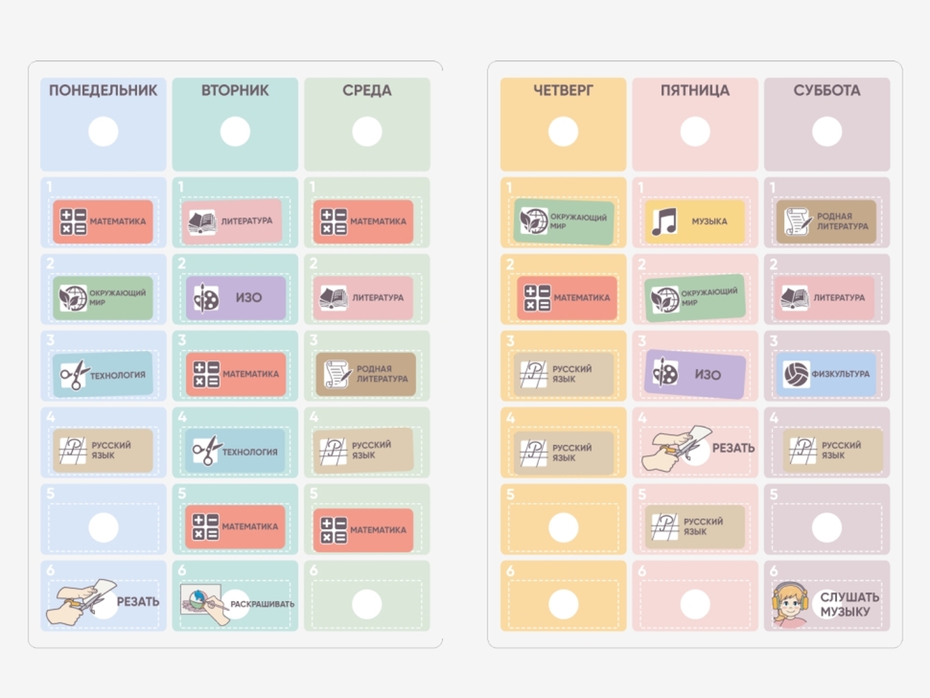 Визуальные опоры для ориентировки школьника в занятости в течении учебной недели. Разработано для шестидневной недели. Подходят для ученика начальной школы.