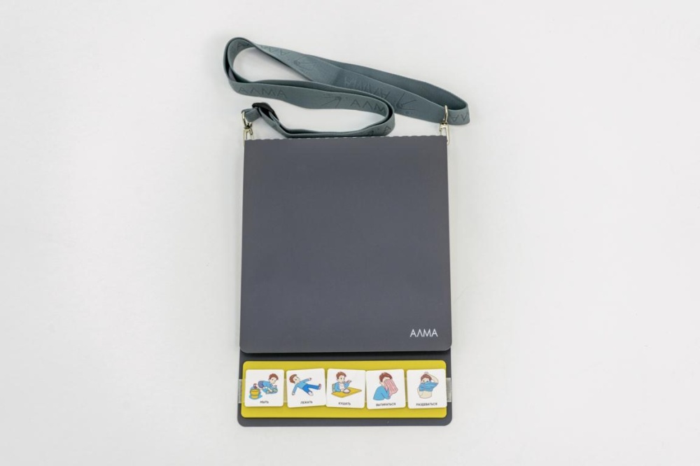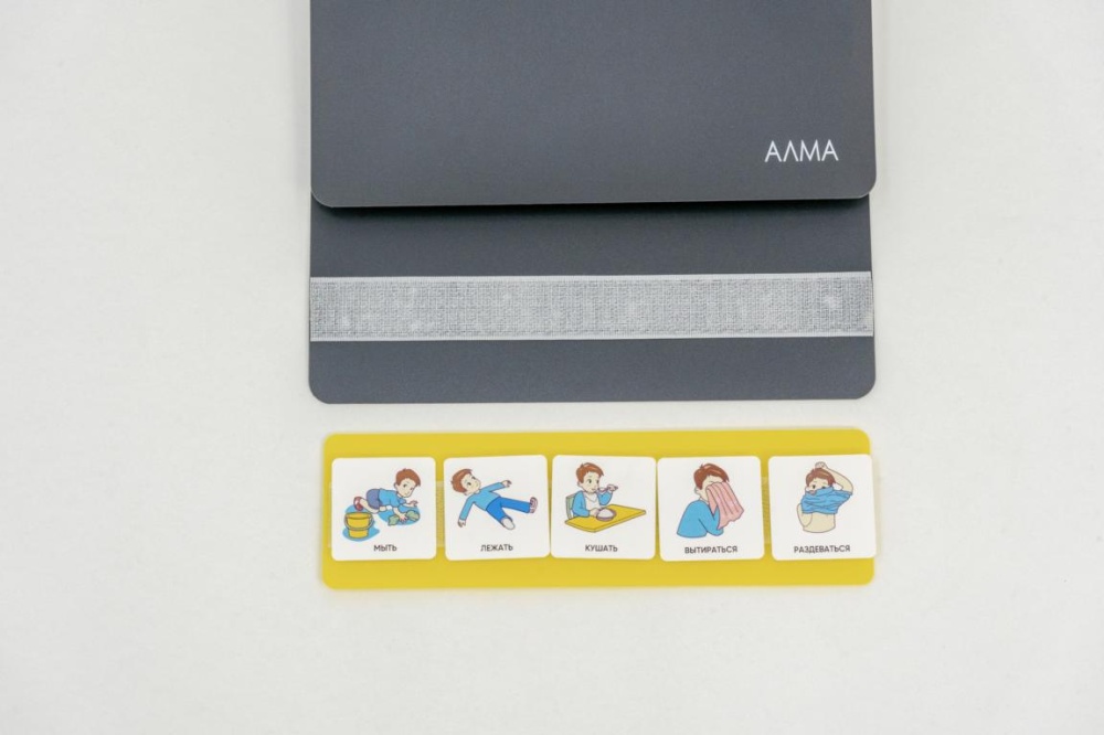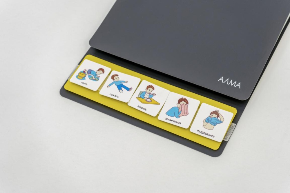 Снизу папки выступает коммуникативная полоса, она сделана так, чтобы карточки на ней всегда были перед глазами ребёнка. Это своеобразная мессенджер-строка, куда ребёнок перемещает нужные ему карточки из общей папки и выстраивает предложение.