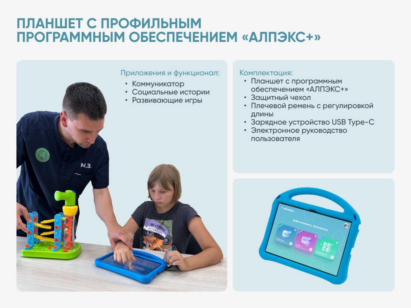 Планшет ориентируется на онтогенетические закономерности развития ребенка, учитывает структуру дефекта и адаптируется под индивидуальные особенности каждого пользователя.
