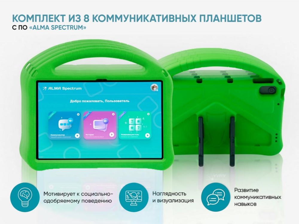 Комплект планшетов с профильным программным обеспечением «АЛПЭКС+» для развития коммуникативных навыков и социальной адаптации детей с расстройствами аутистического спектра.