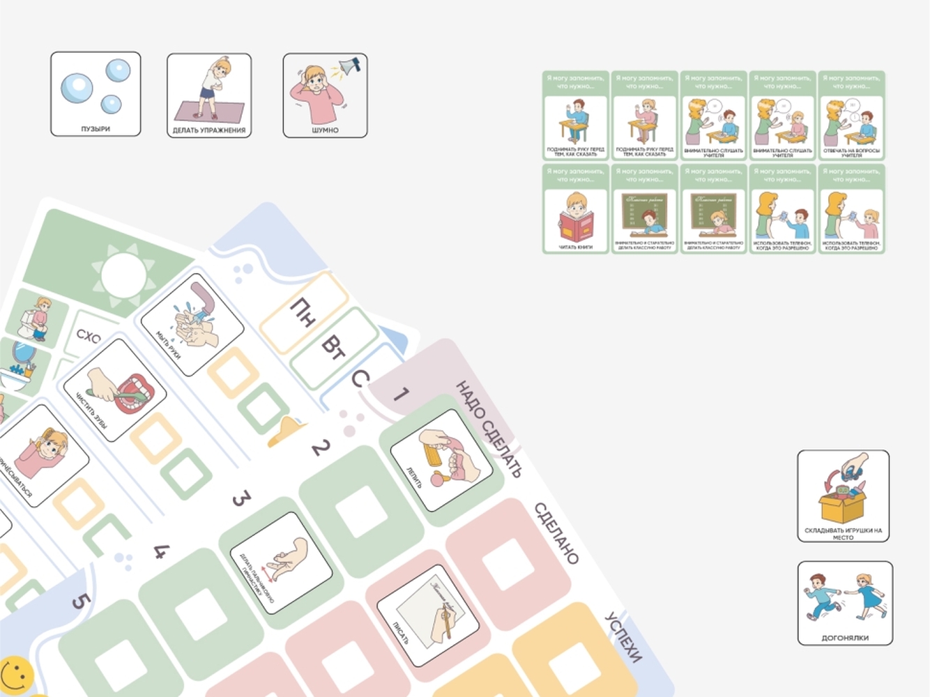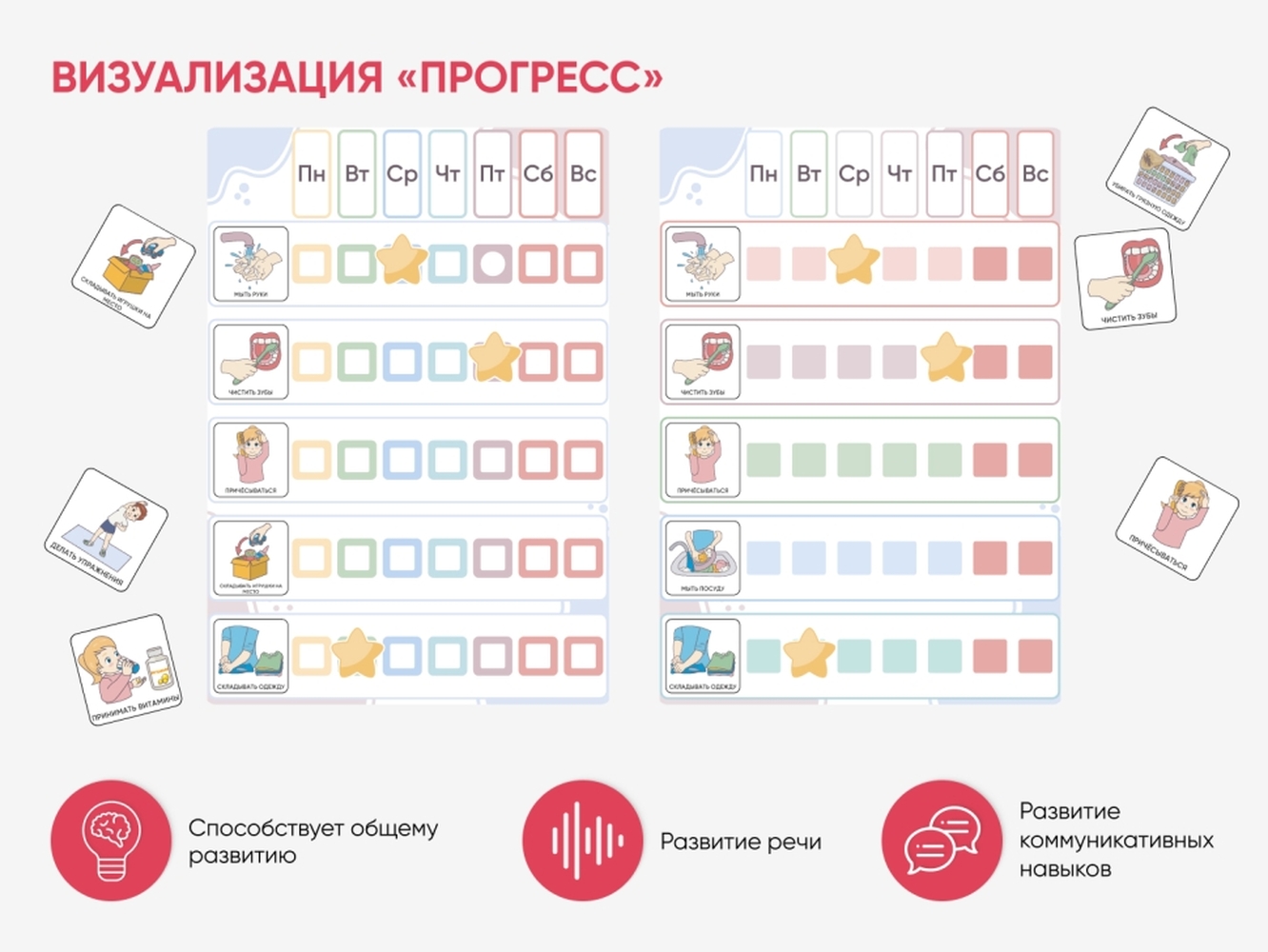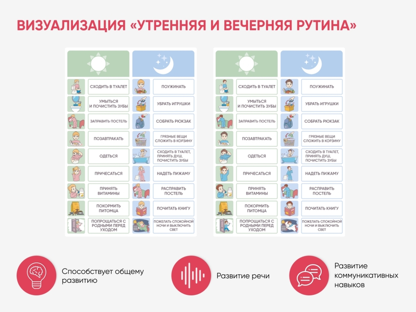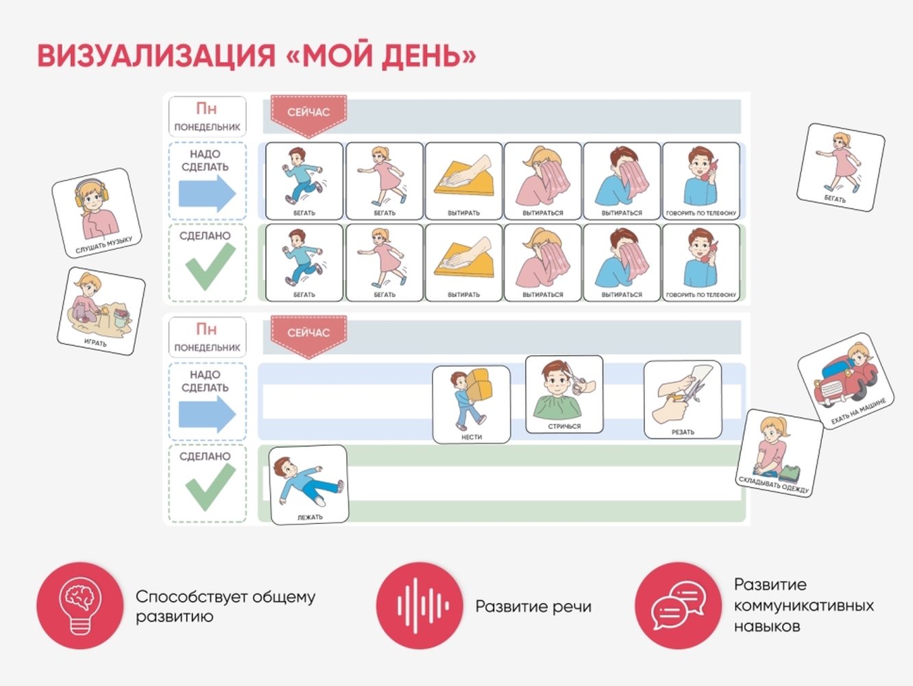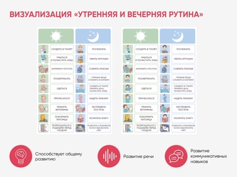 • Визуализация для демонстрации последовательности событий в течении дня. Помогает снять напряжение, поддерживает мотивацию ребенка.