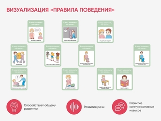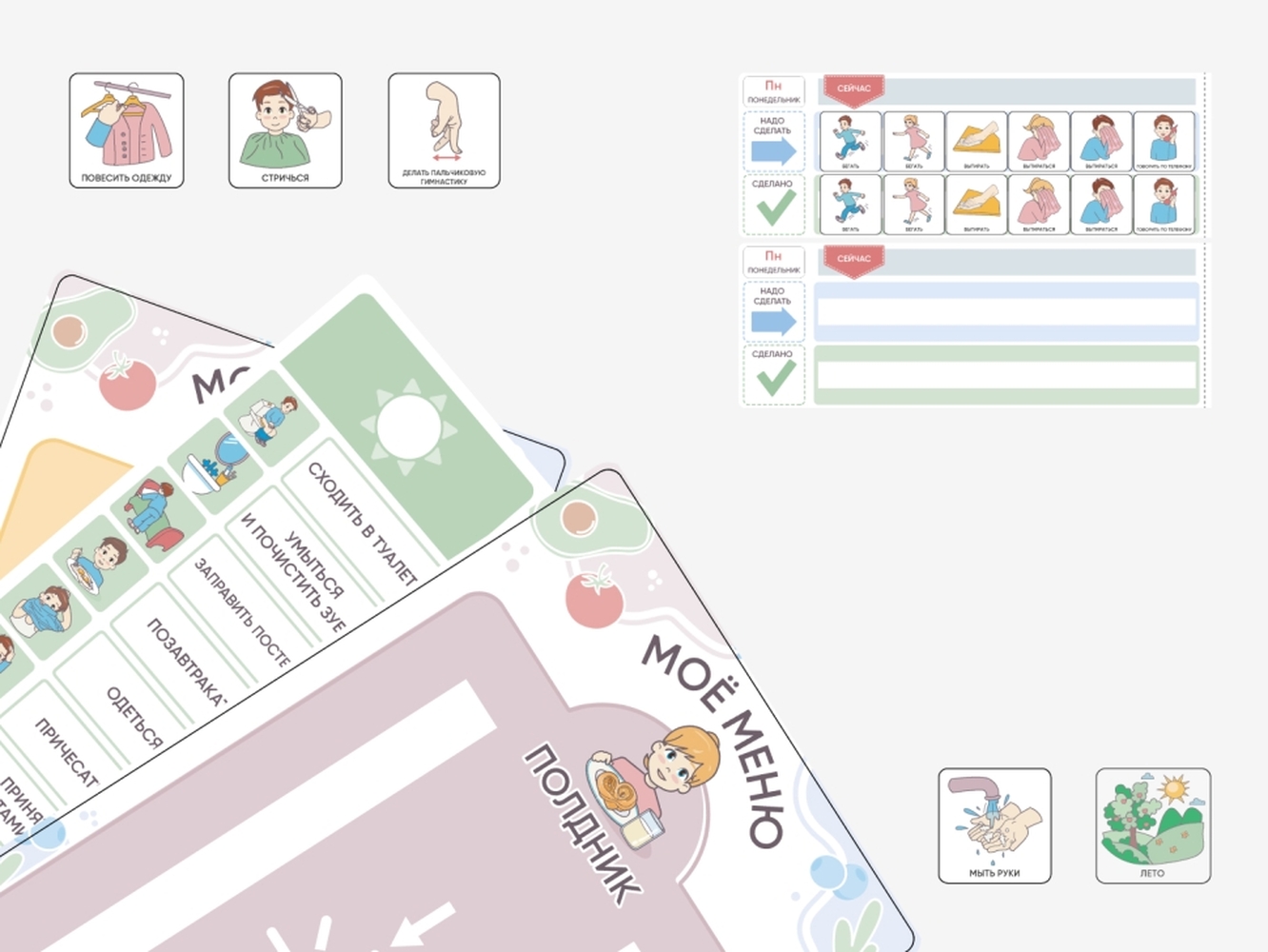 Комплект листов с картинками, позволяющими визуализировать для детей последовательность ключевых событий в жизни и структурировать распорядок дня.