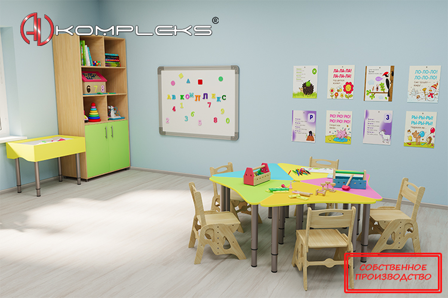 - Детский модульный стол – подходит для проведения групповых занятий с детьми. Регулируемые секции позволяют подстроить стол под рост каждого ребенка, обеспечивая правильную осанку и комфорт. Стол оснащен колесиками, что делает его мобильным. Яркий привлекательный дизайн стола создает уютную доброжелательную атмосферу.