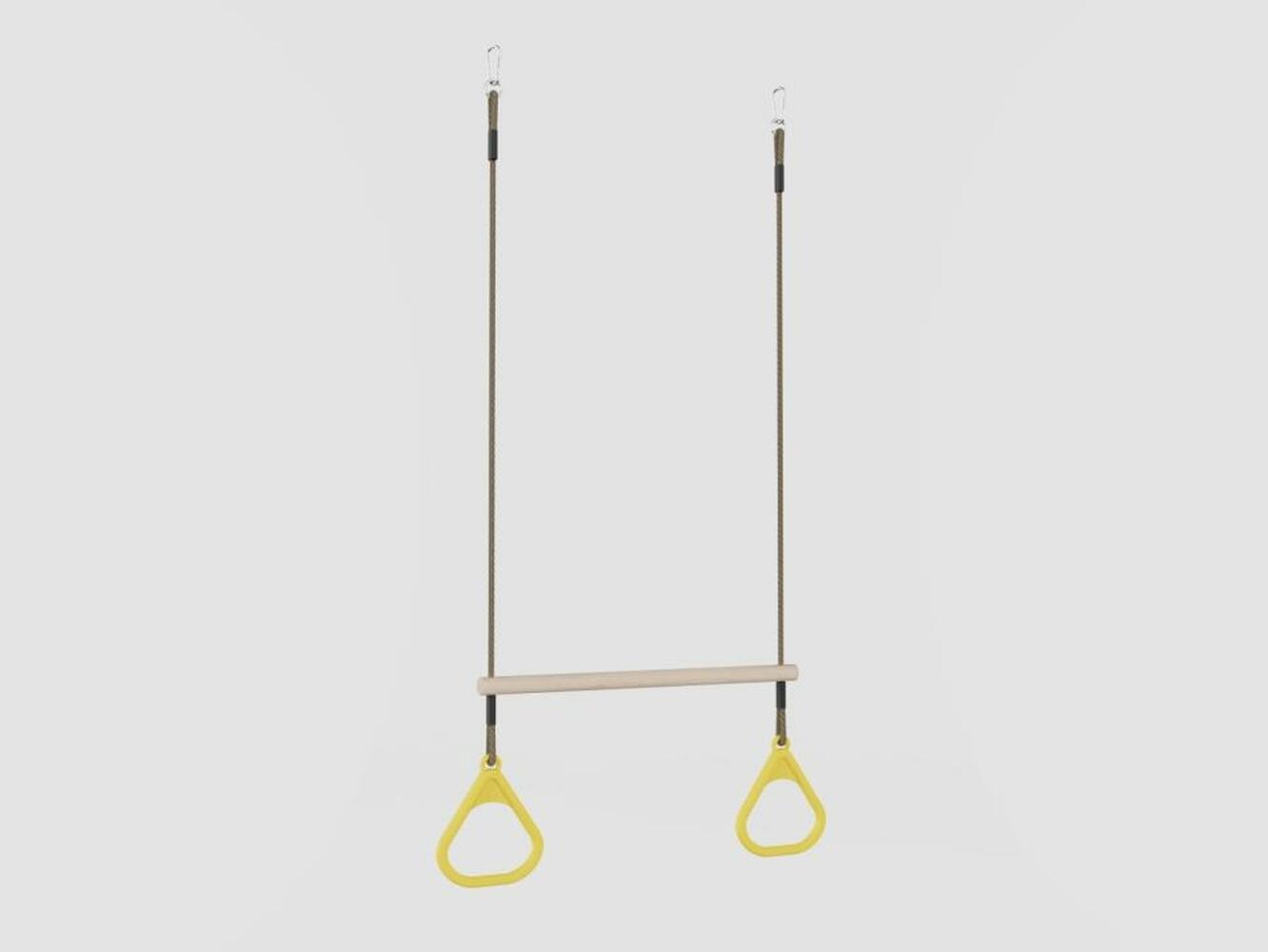Кольца выполнены из прочного нескользящего пластика, подвес колец к комплексу осуществляется с помощью стальных карабинов и нейлонового троса, выдерживающего вес до 150 кг.