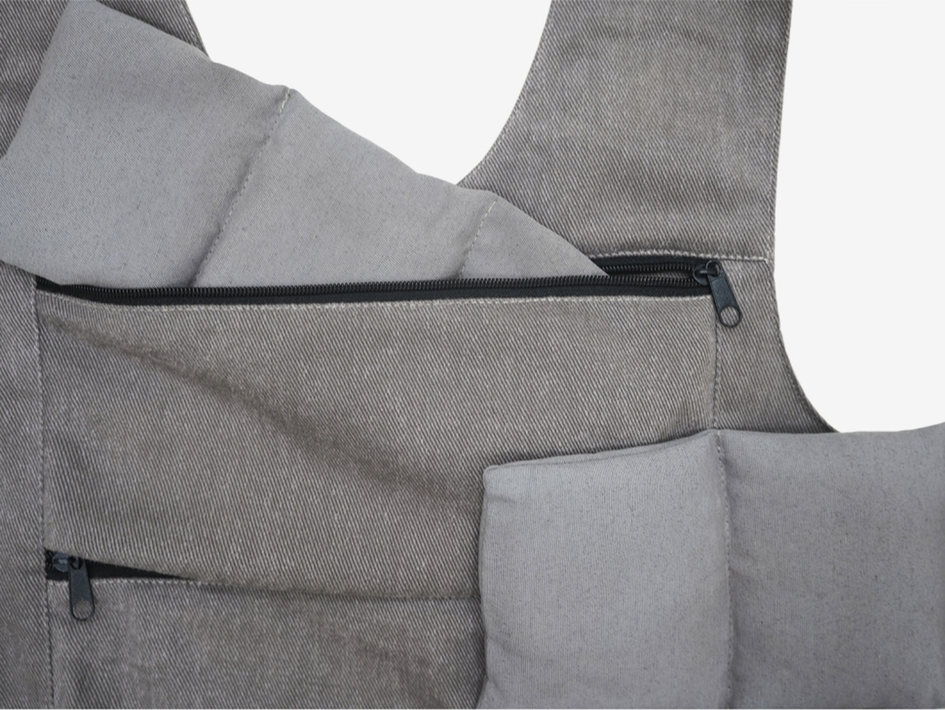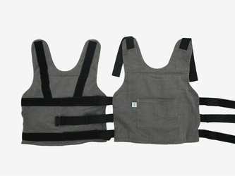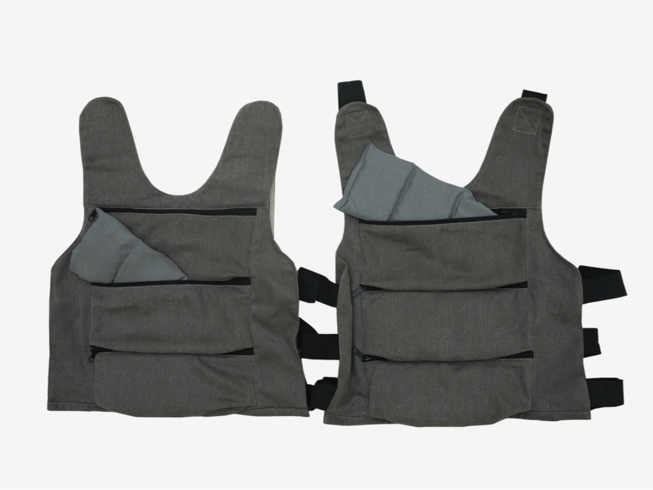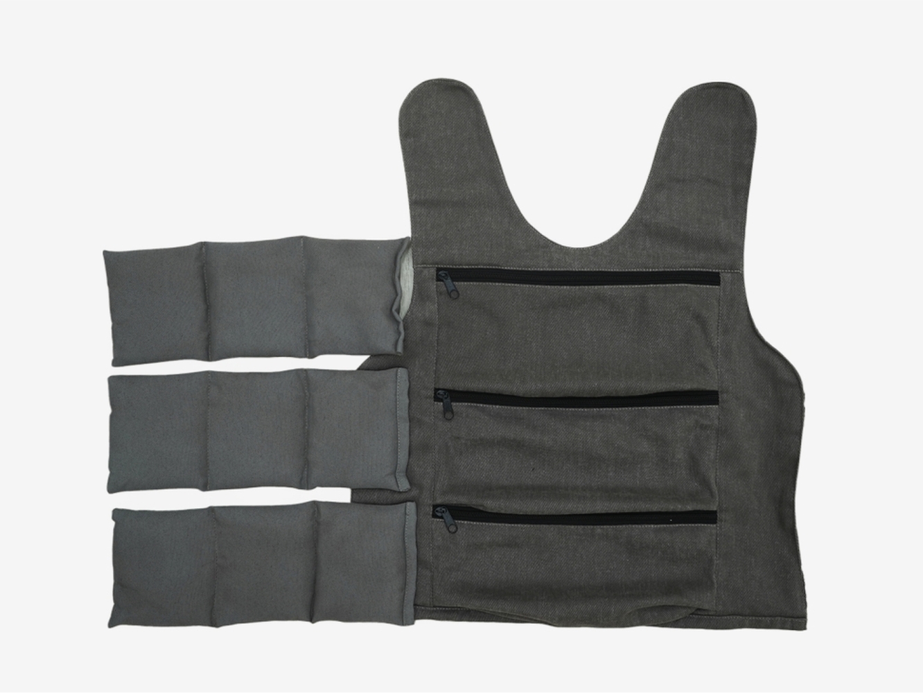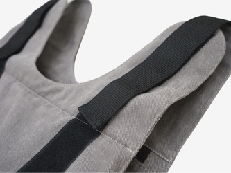 Утяжеленный жилет с изменяемым весом: от 0,4 кг до 12 кг. На обеих сторонах жилета есть по три кармана, за молниями которых лежат мешочки с грузом. Это позволяет легко менять вес жилета, добавляя и убирая мешочки. Размер и посадку утяжеленного жилета можно регулировать.