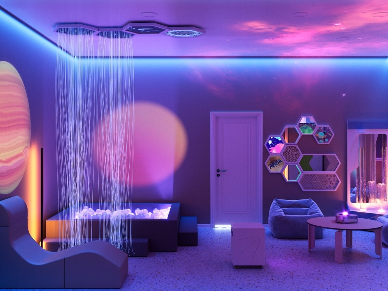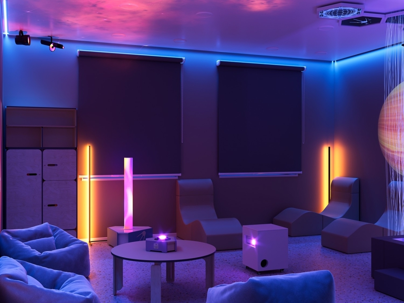 Мягкие светодиодные панели, светильники, проекционное оборудование и световой прожектор создают атмосферу уюта и безопасности. Смена цветов и динамика освещения положительно воздействуют на нервную систему и способствуют расслаблению.