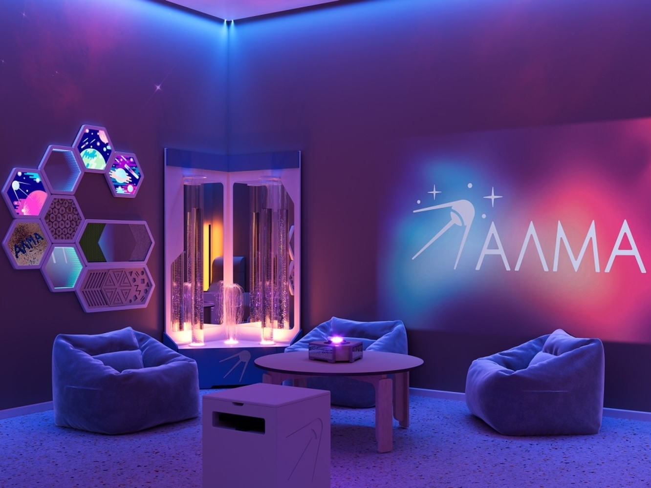 Готовое решение для создания сенсорной комнаты от компании АЛМА. Комплект оборудования и мебели позволяет организовать пространство, которое будет оказывать расслабляющий эффект за счет мягкого воздействия на органы чувств.