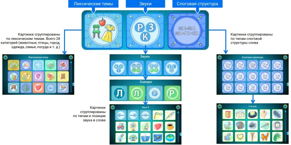 Программно-методический комплекс содержит материалы для обеспечения проведения коррекции лексико-грамматического строя речи, коррекции фонетической стороны речи, коррекции слоговой структуры слова, коррекции нарушений фонематического слуха и восприятия и формирования основ звукового анализа и синтеза.