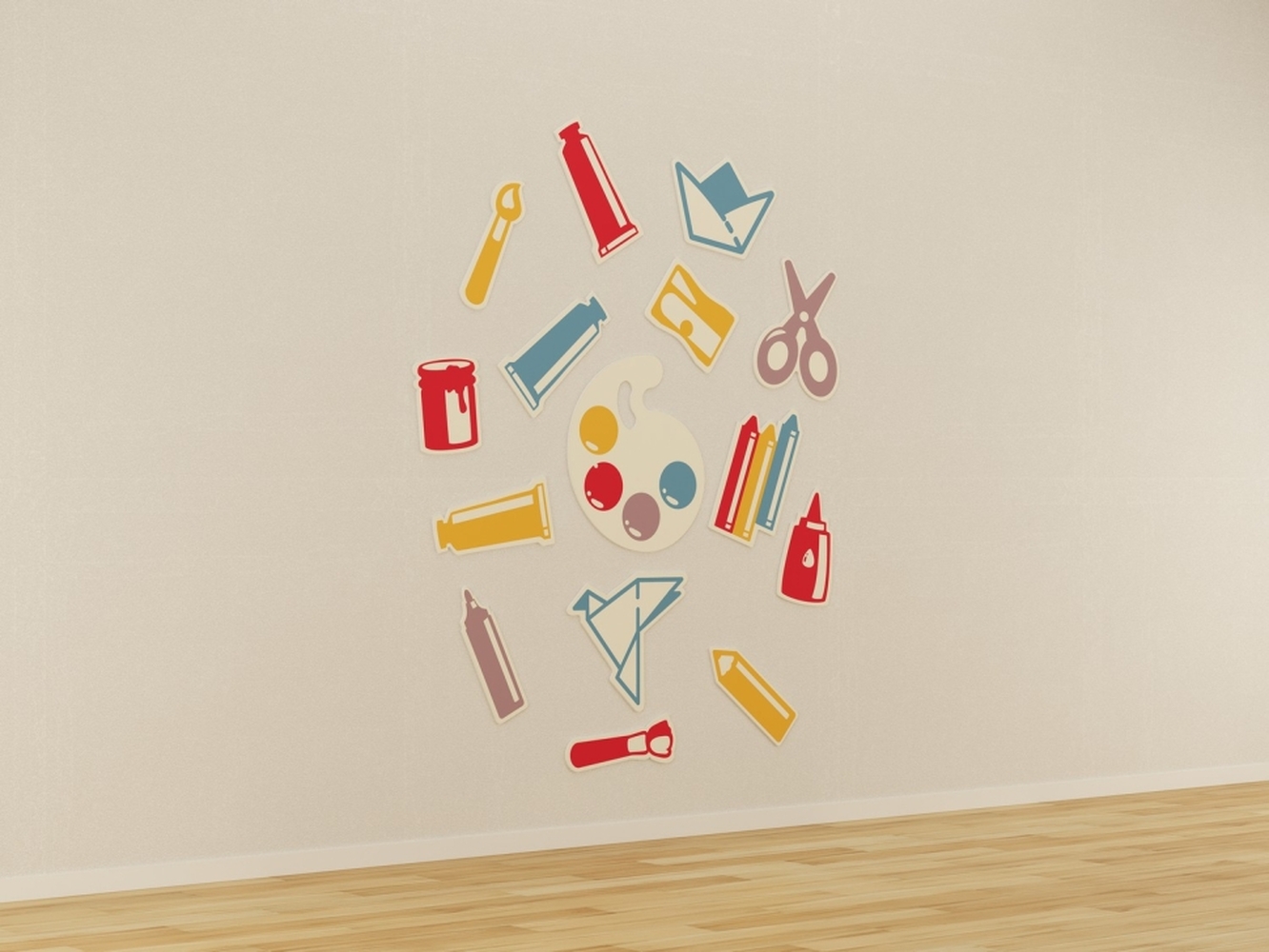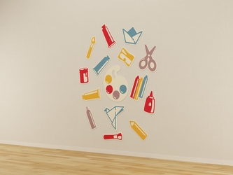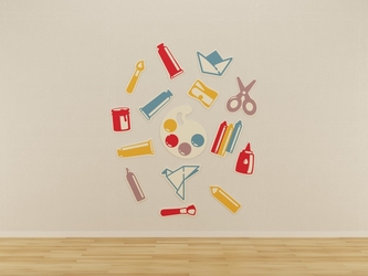 Набор ярких декоративных панелей, оформленных в тематике изобразительного искусства. Каждая панель выполнена в виде узнаваемых предметов, используемых на уроках изобразительного искусства: палитры, кисточек, карандашей, ножниц, тюбиков с краской и других художественных принадлежностей. Изготовлены из качественных, безопасных материалов с гладкой окрашенной поверхностью, которую легко очищать влажной тряпкой.