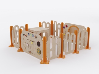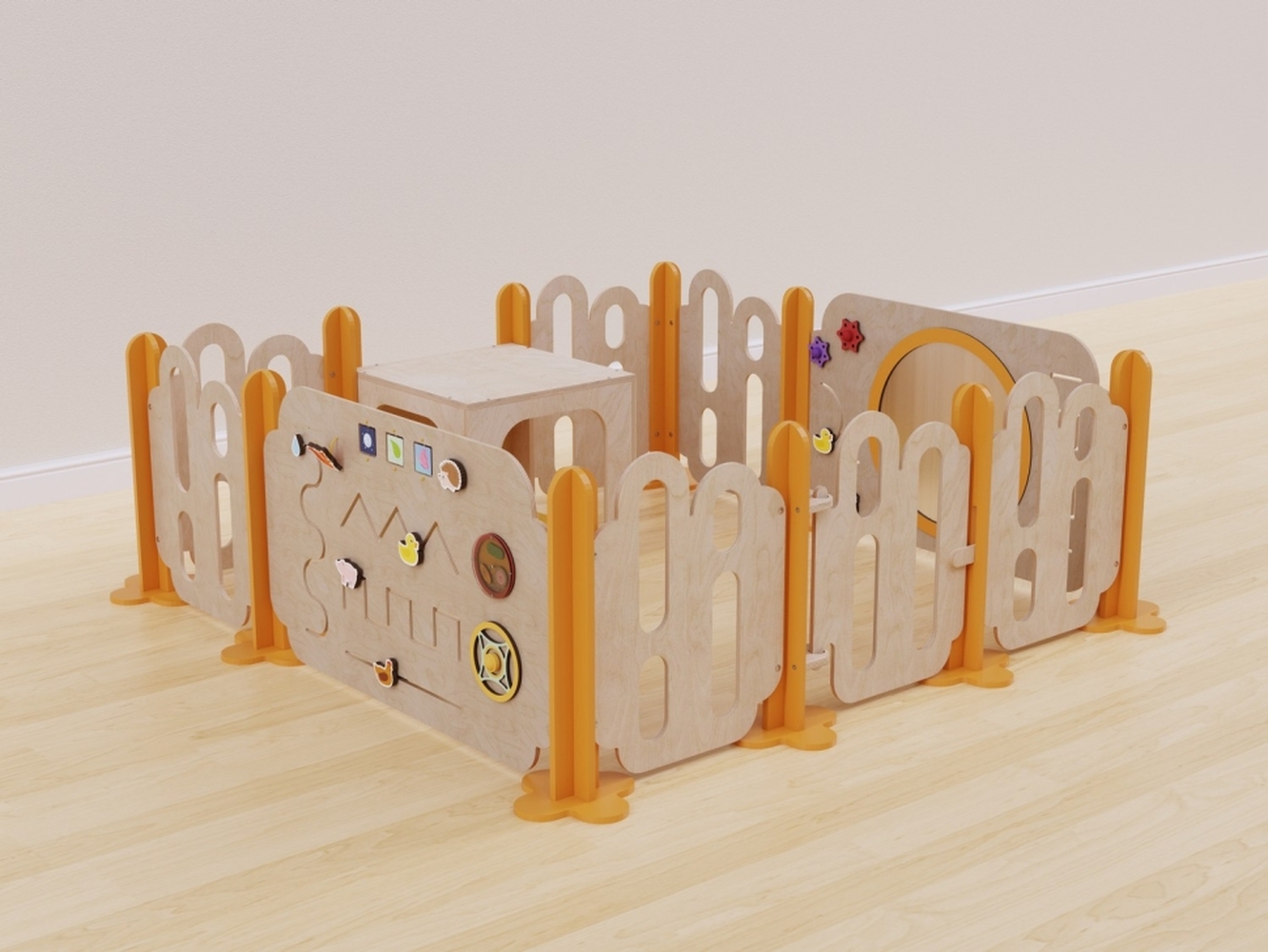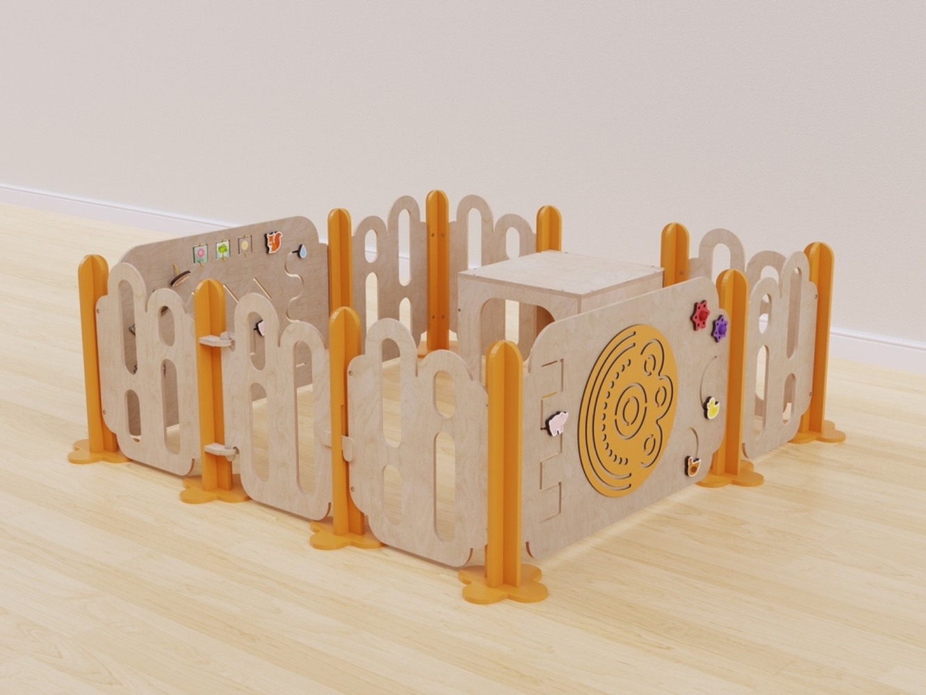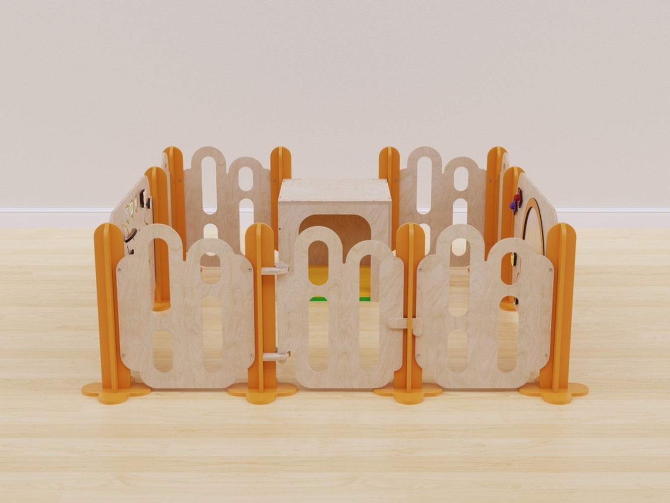 Манеж обеспечивает безопасность малышей, а дополнительные элементы конструкции — куб и бизиборды — расширяют игровое пространство и способствуют развитию координации, моторики и фантазии.