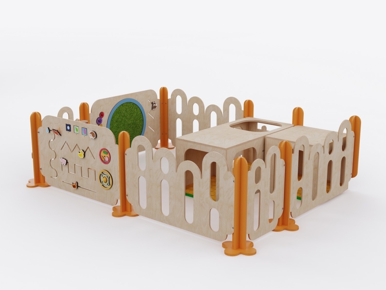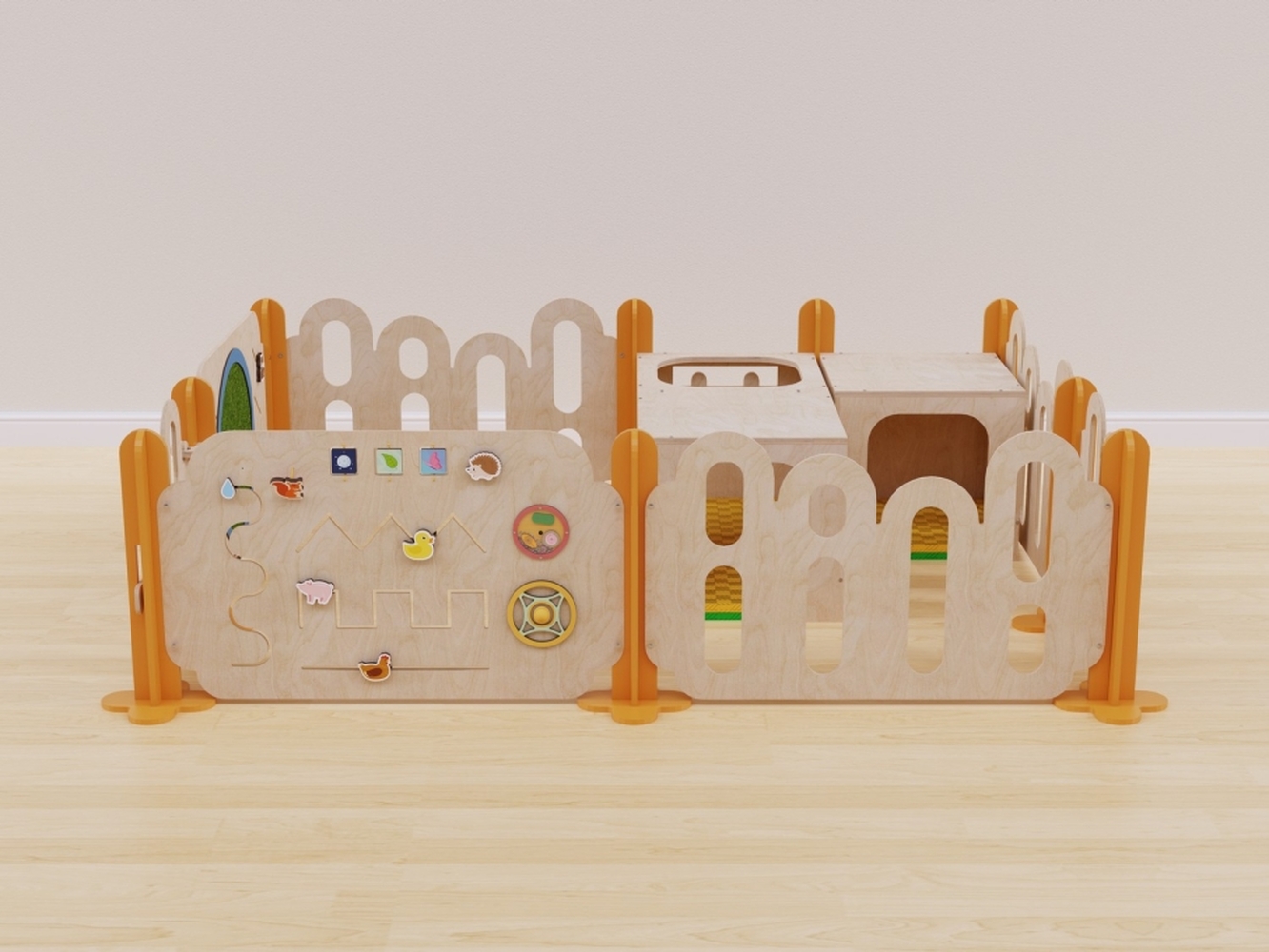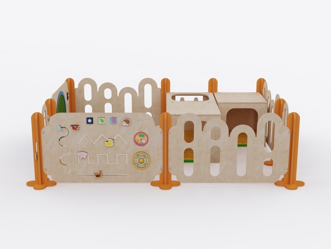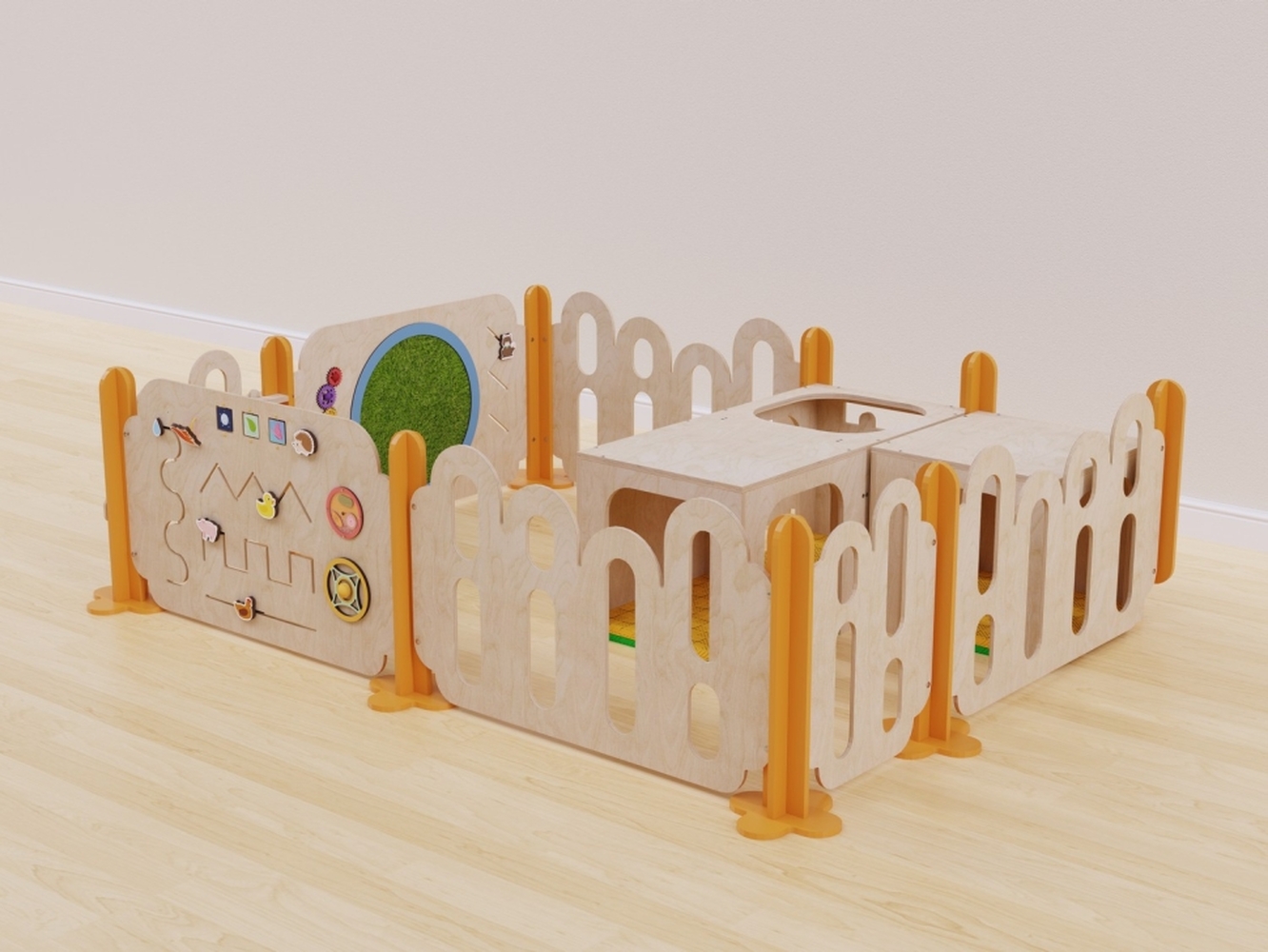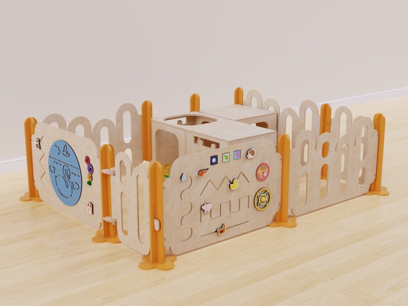 Манеж обеспечивает безопасность малышей, а дополнительные элементы конструкции — кубы и бизиборды — расширяют игровое пространство и способствуют развитию координации, моторики и фантазии.