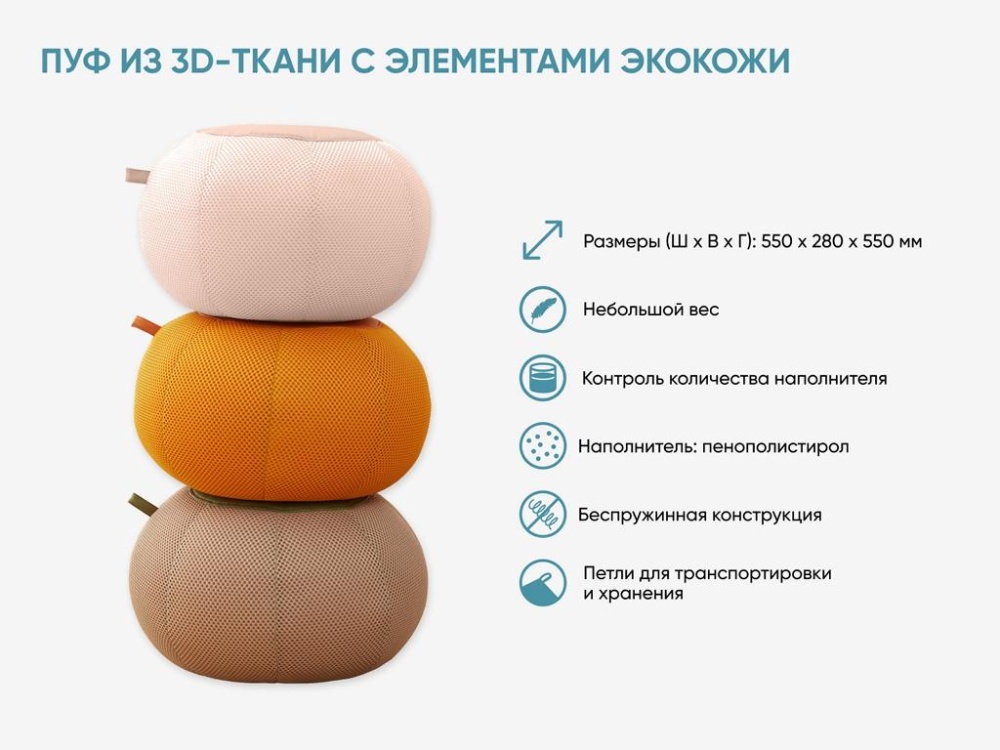 Легкий и удобный бескаркасный пуф. Изготовлен из прочной и дышащей 3D-ткани с элементами износостойкой экокожи и наполнен пенополистиролом, что обеспечивает его легкость.