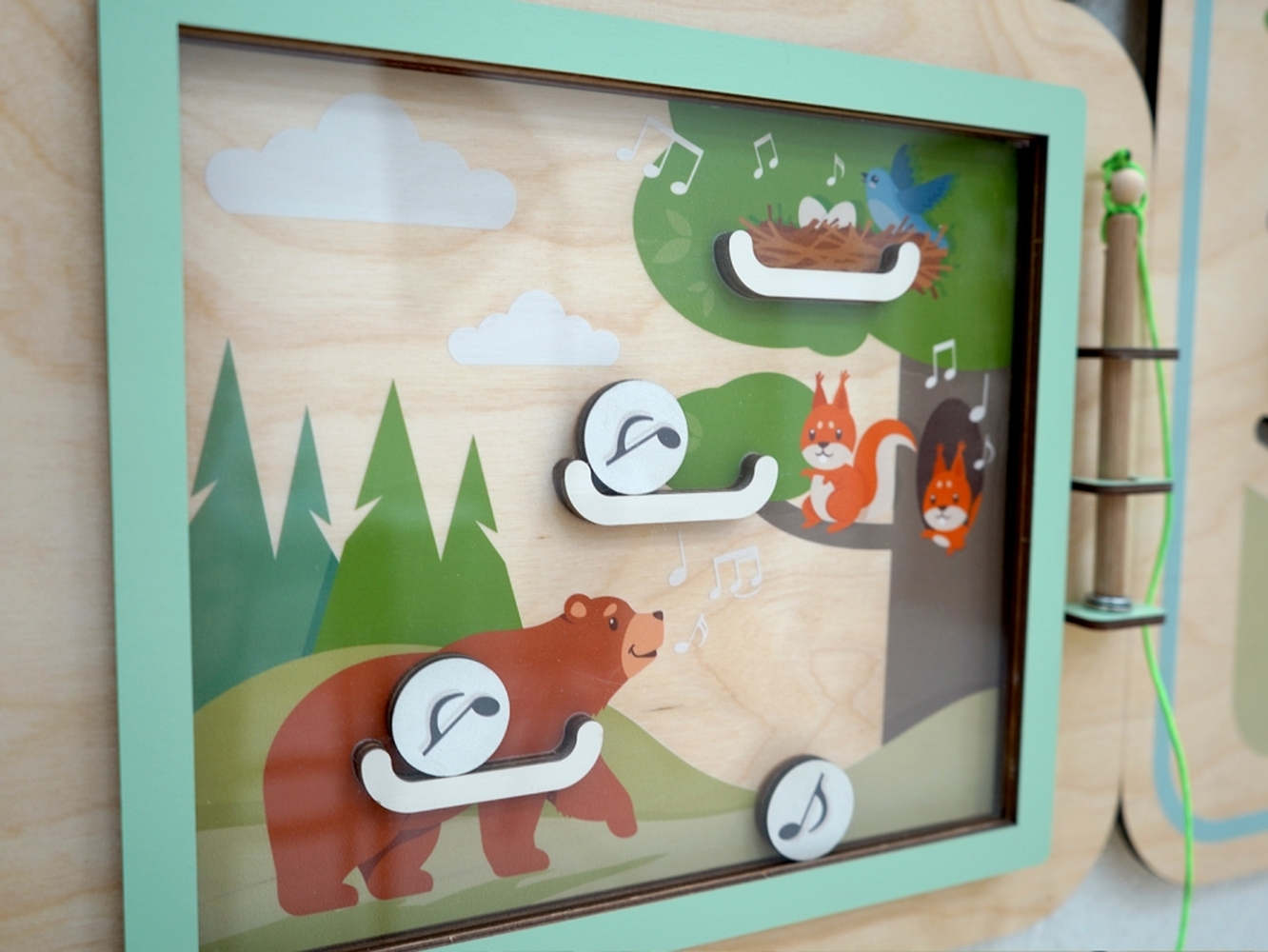 Модуль «Музыкальные регистры» с магнитной указкой-манипулятором и подвижными нотками знакомит детей с тремя вариантами звуков: высокий регистр — птички, средний — белочки, низкий — медведь. После прослушивания звукоряда, аккорда или мелодии дети выбирают подходящий регистр и перемещают нотку на нужную позицию.