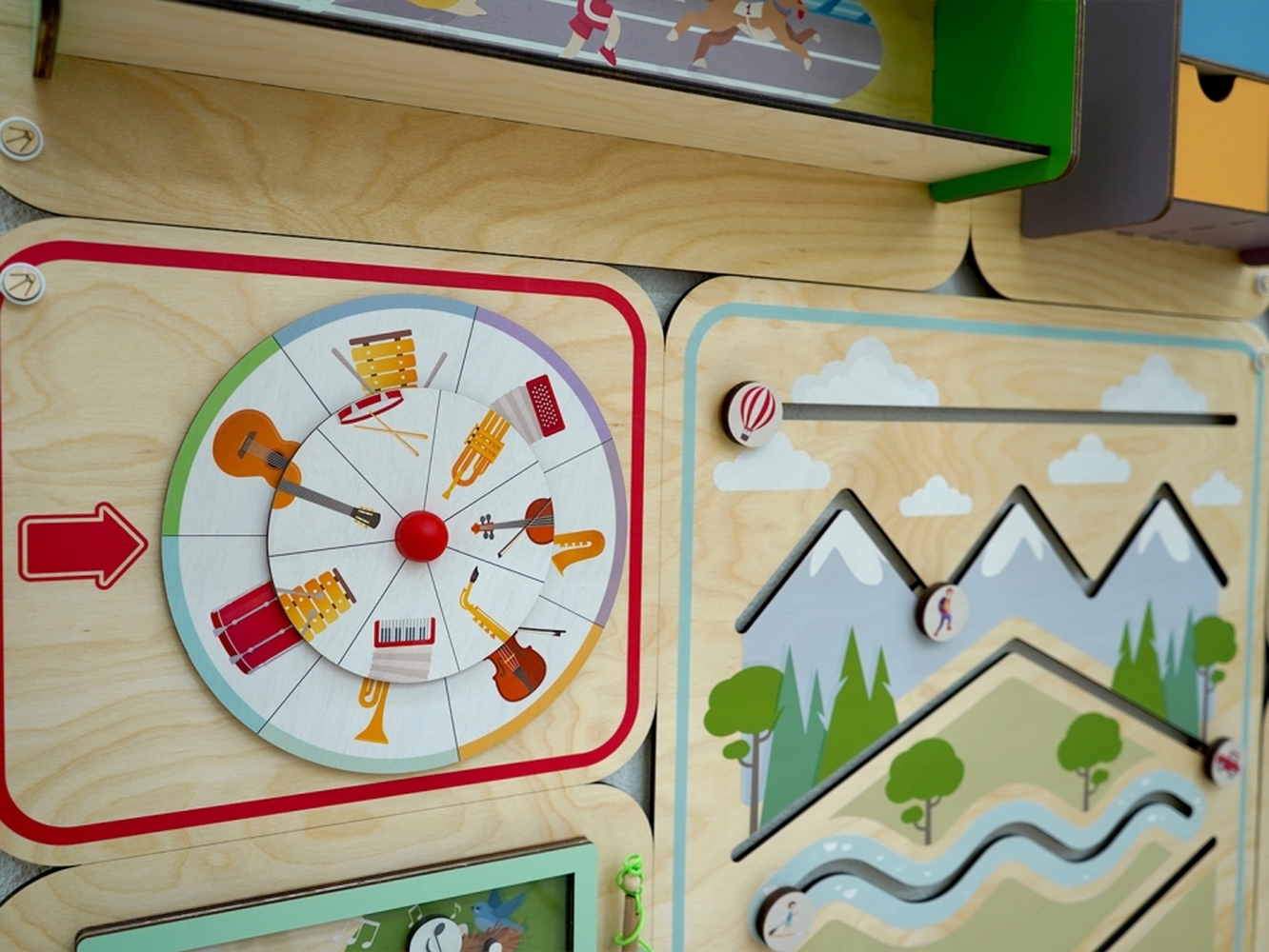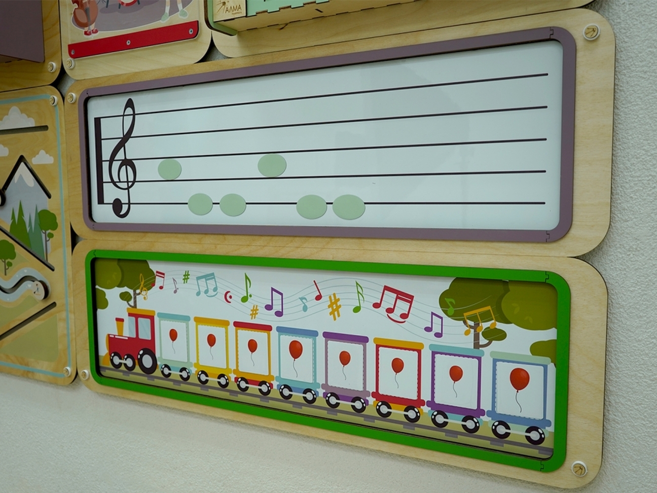 Дидактические панели можно дополнить наборами цветных и иллюстрированных стеновых панелей. Это позволит оформить все помещение в едином стиле.
