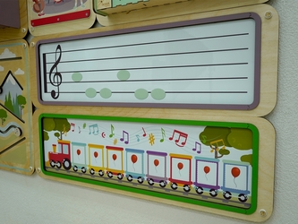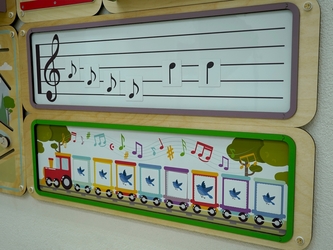 Дидактическая панель служит для организации работы по эстетическому воспитанию и знакомит детей с нотной грамотой, типами мелодий, ритмическими рисунками и музыкальными инструментами.