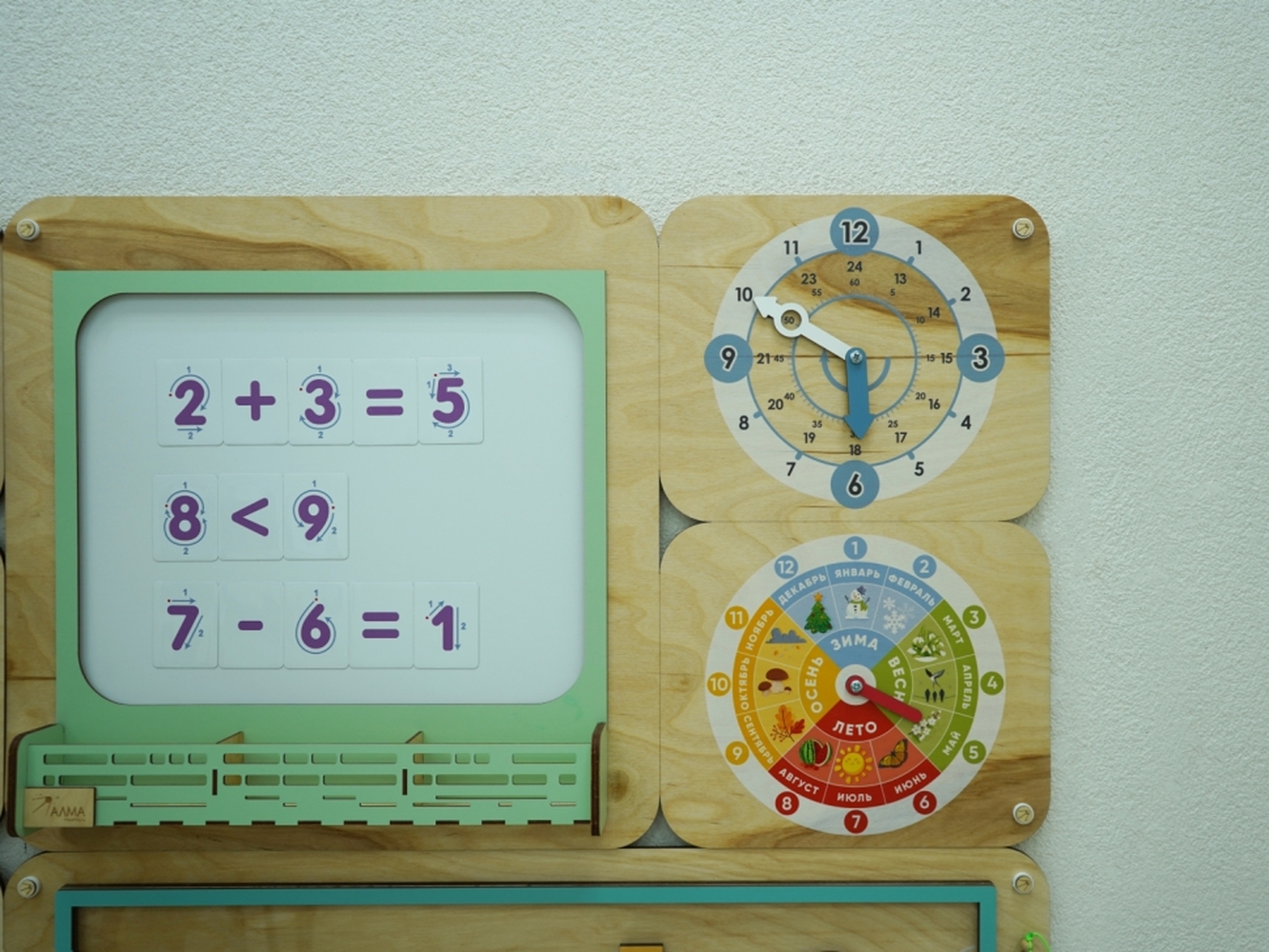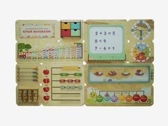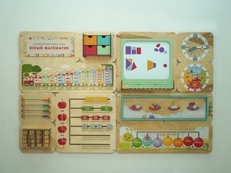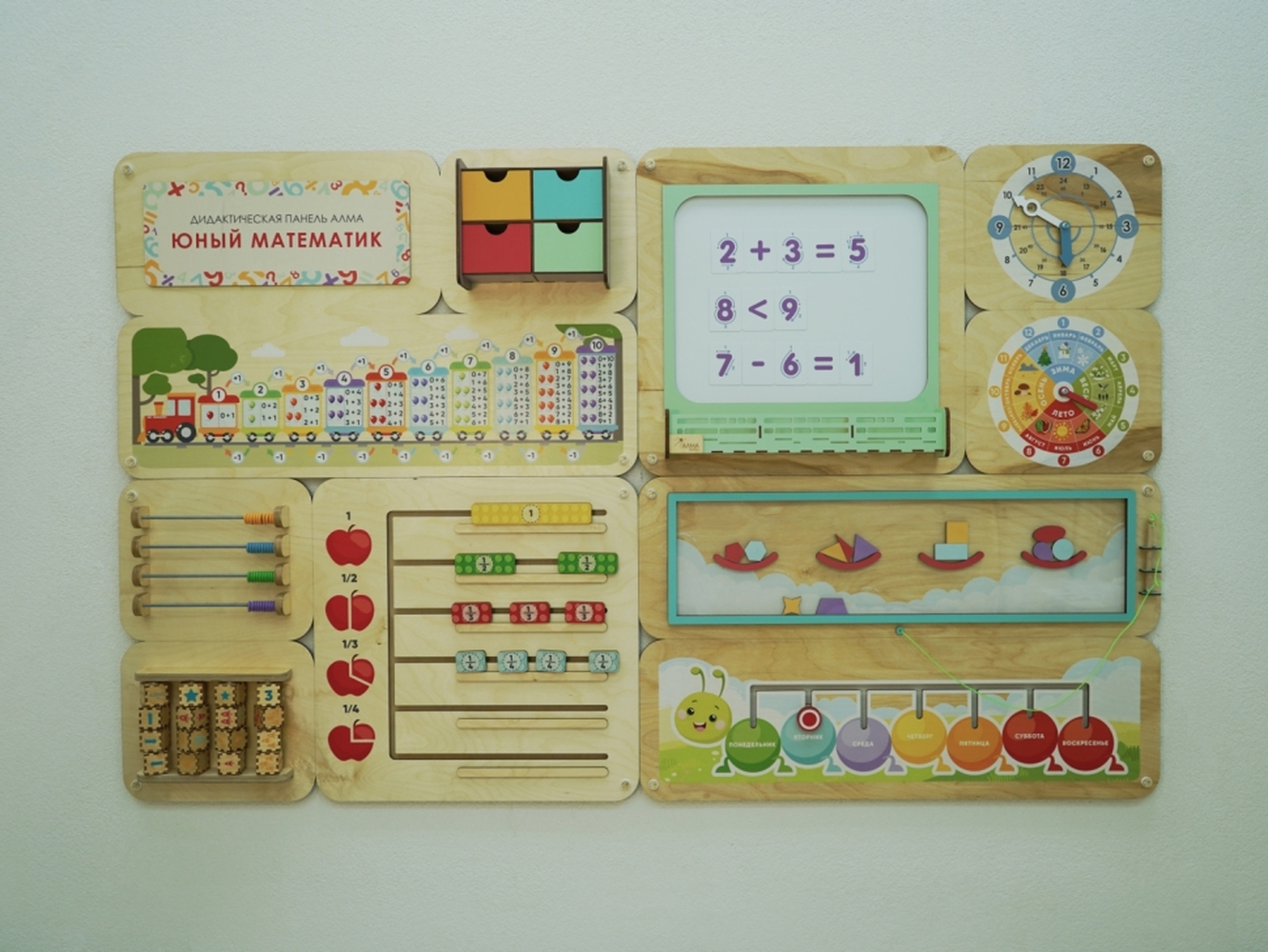 Дидактическая панель «Юный математик» разработана методистами, дизайнерами и конструкторами компании АЛМА для создания развивающей предметно-пространственной среды, формирования интереса к математике, познавательного развития детей, а также для оформления стен детского сада.