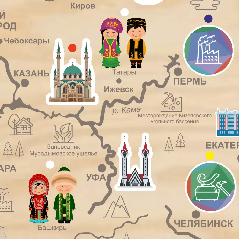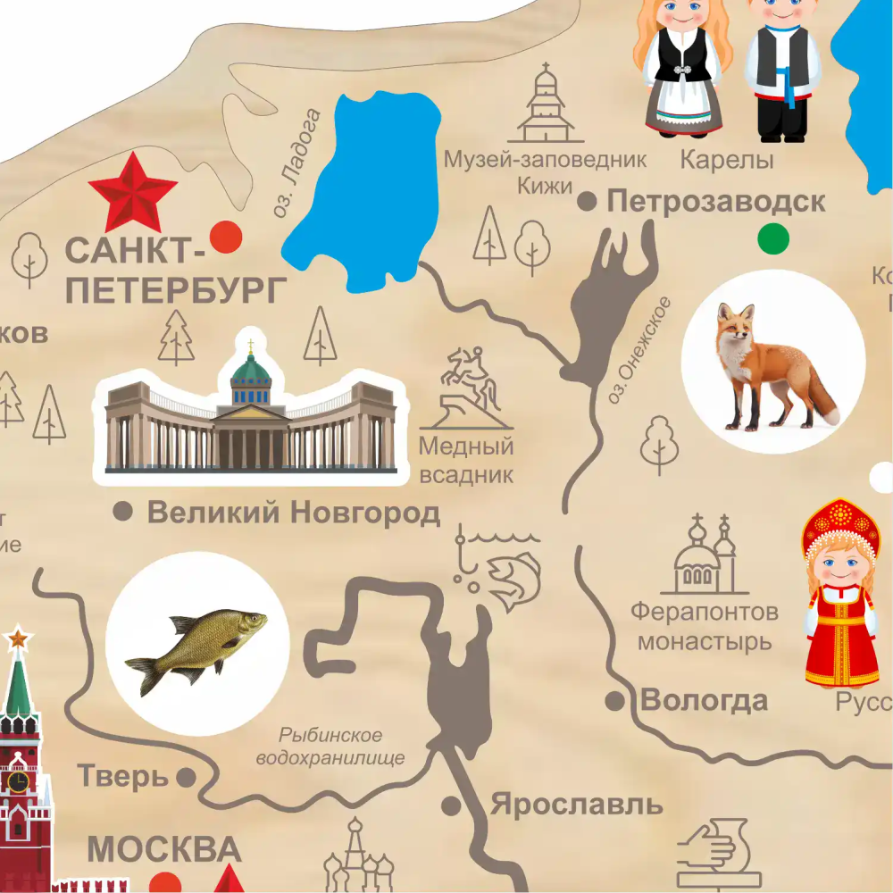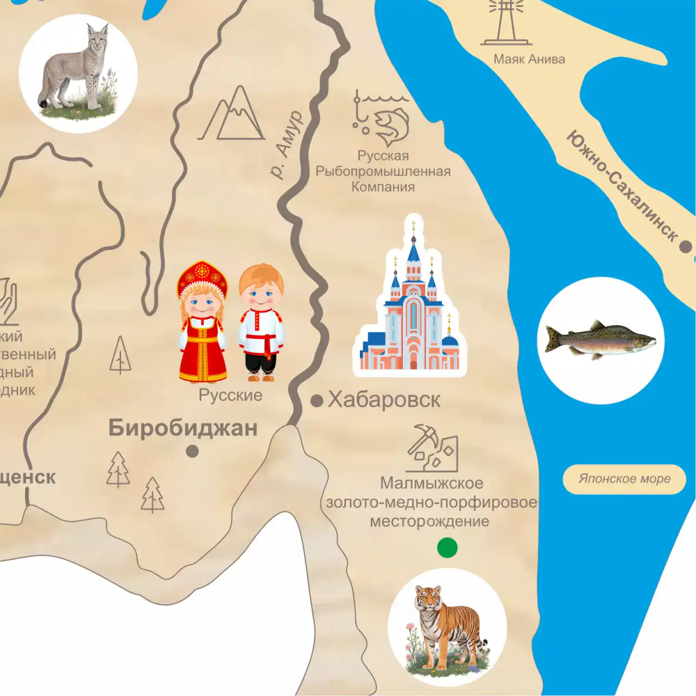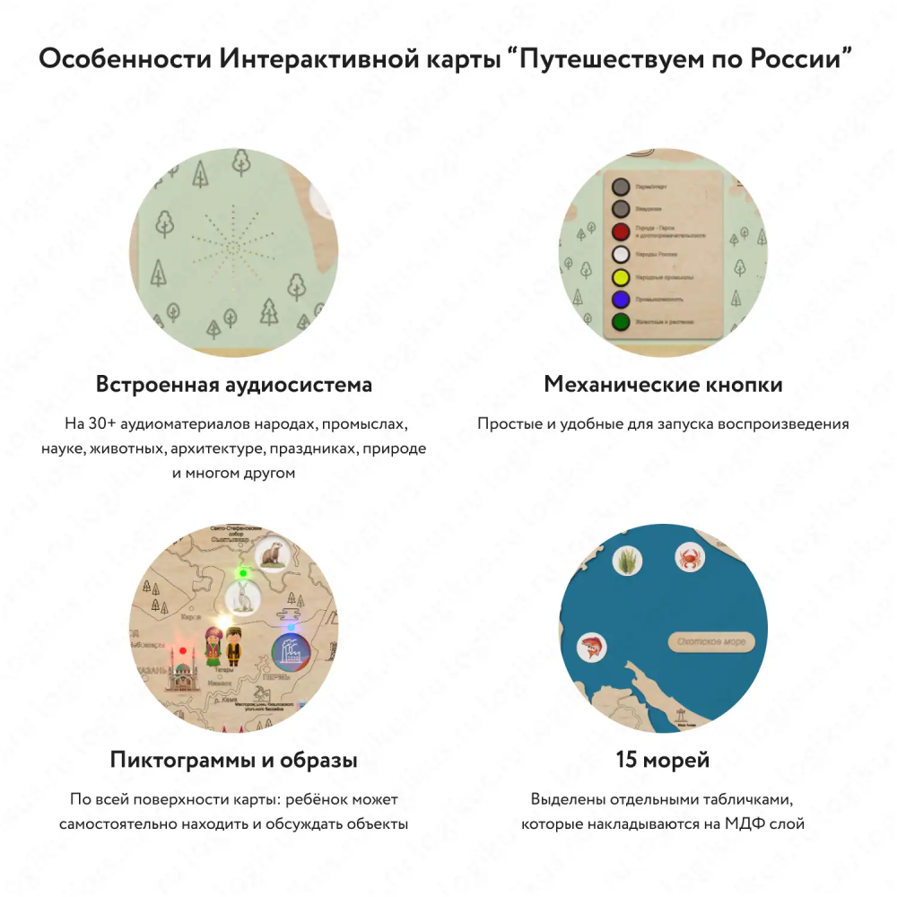 - Встроенная аудиосистема на 30+ аудиоматериалов — о народах, промыслах, науке, животных, архитектуре, праздниках, природе и многом другом.
