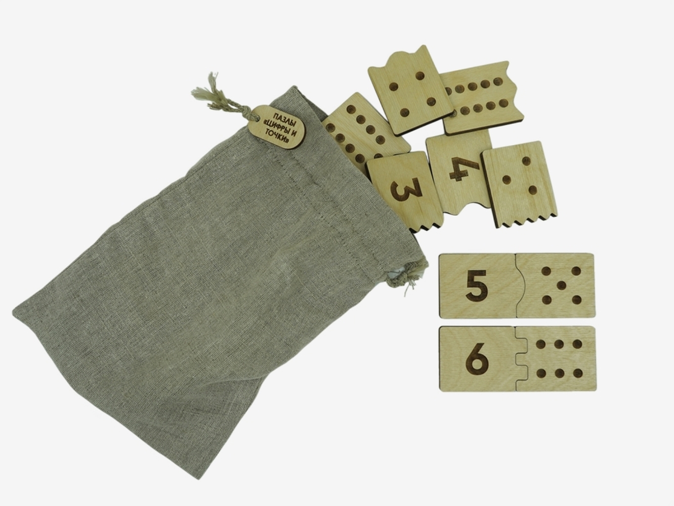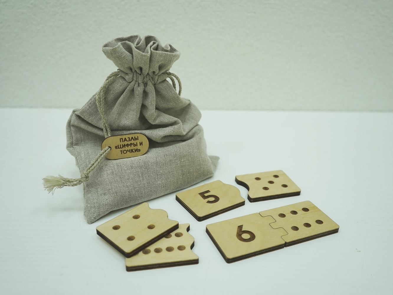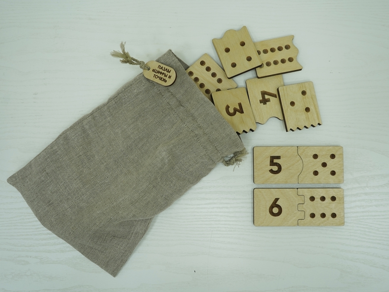 Гравировка позволяет задействовать в игре не только визуальный, но и тактильный анализатор, что закрепляет знания детей о количестве и цифре. Непрозрачный хлопковый мешочек позволит организовать игры типа «Чудесный мешочек» и внесет элемент неожиданности и занятия с детьми. Свободная от рисунков и иных отметок оборотная сторона деталей дает возможность организовывать игры типа «Мемо».