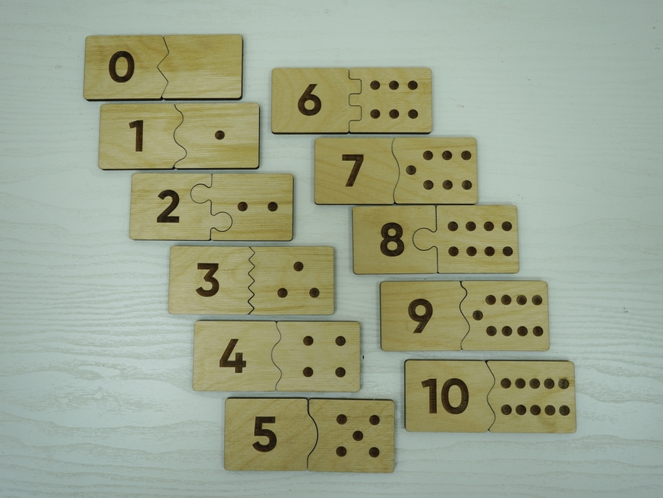 Классическая игра-пазл в математической тематике. Задача детей: сопоставить количество и цифру. Игра предполагает только один правильный ответ: линия разреза уникальна и показывает детям на ошибку в соединении деталей.
