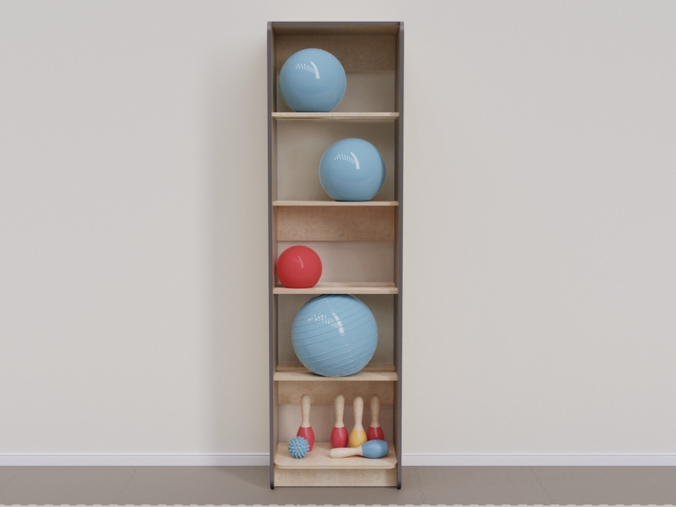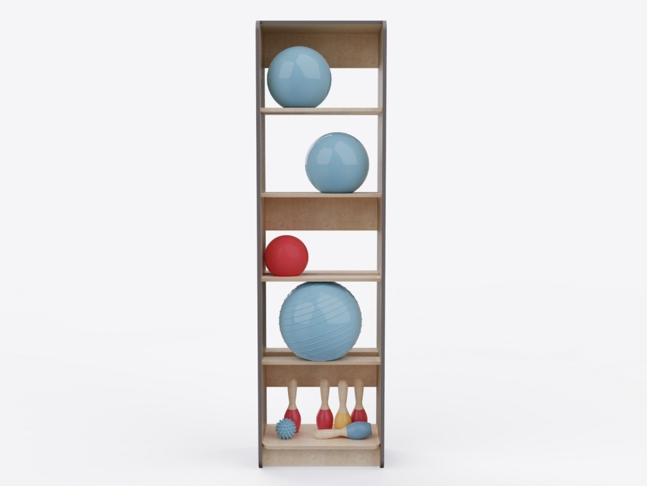 Стеллаж с полками для хранения мячей диаметром от 15 до 30 см. На одной полке высотой 36,5 см в среднем помещается 2 мяча. Задней стенки у стеллажа нет. Нижняя полка подходит для хранения разного спортивного инвентаря.