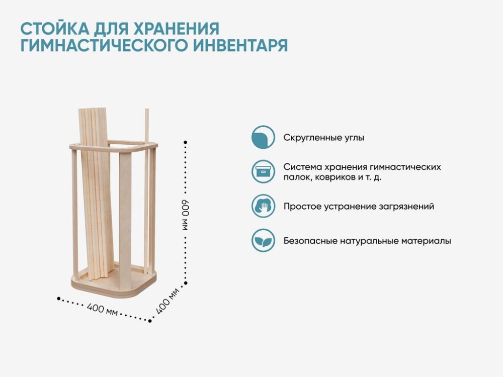 Стойка выполнена из высококачественных и прочных материалов, безопасных для использования детьми. Соответствует актуальным ГОСТам на детскую мебель и инвентарь для спортивных залов, требованиям СанПиН и пожарной безопасности, рекомендациям ФОП ДО по созданию развивающей среды для детей. Гладкие поверхности просты в уходе: достаточно влажной уборки для поддержания высокого уровня гигиены.