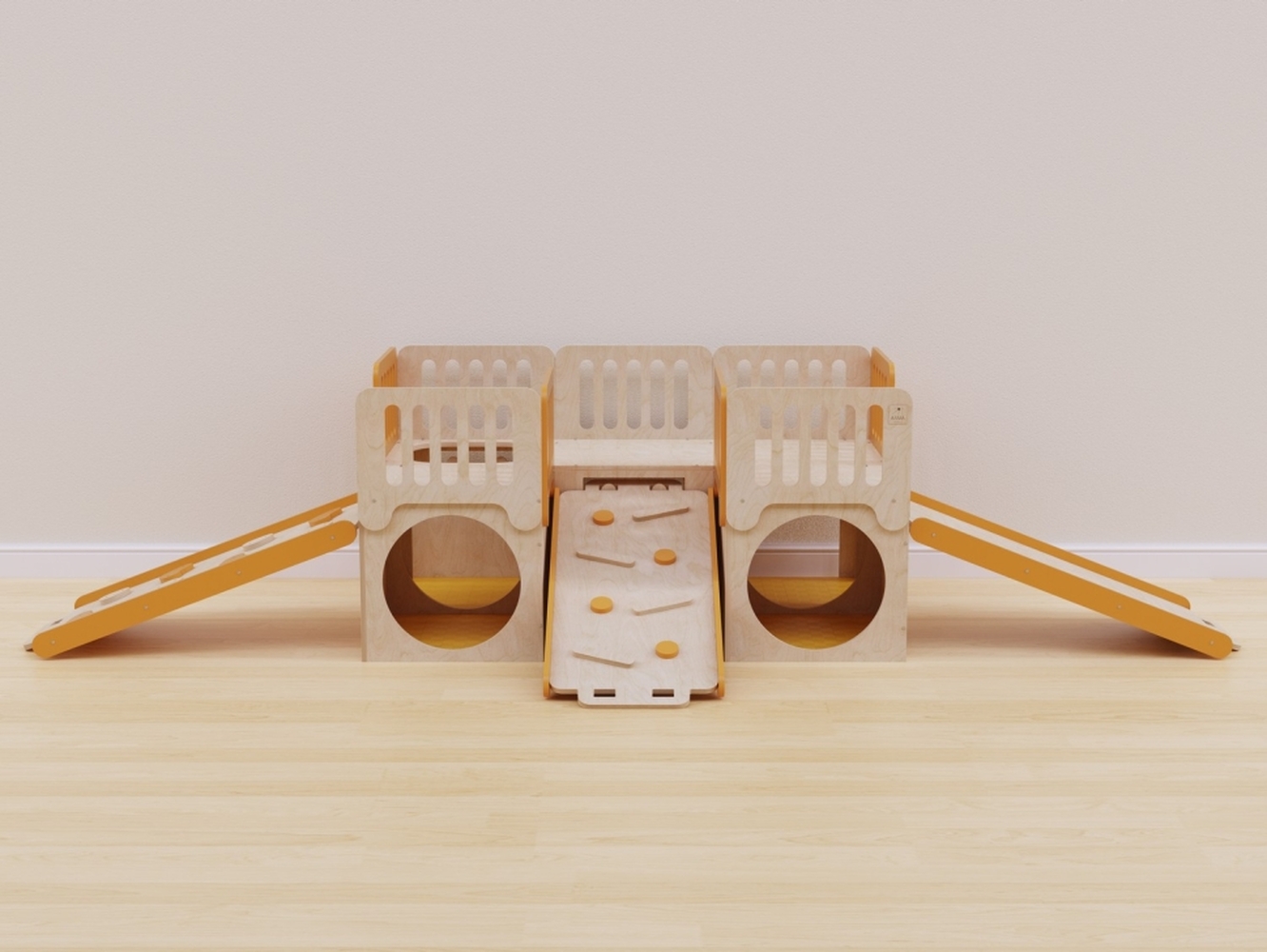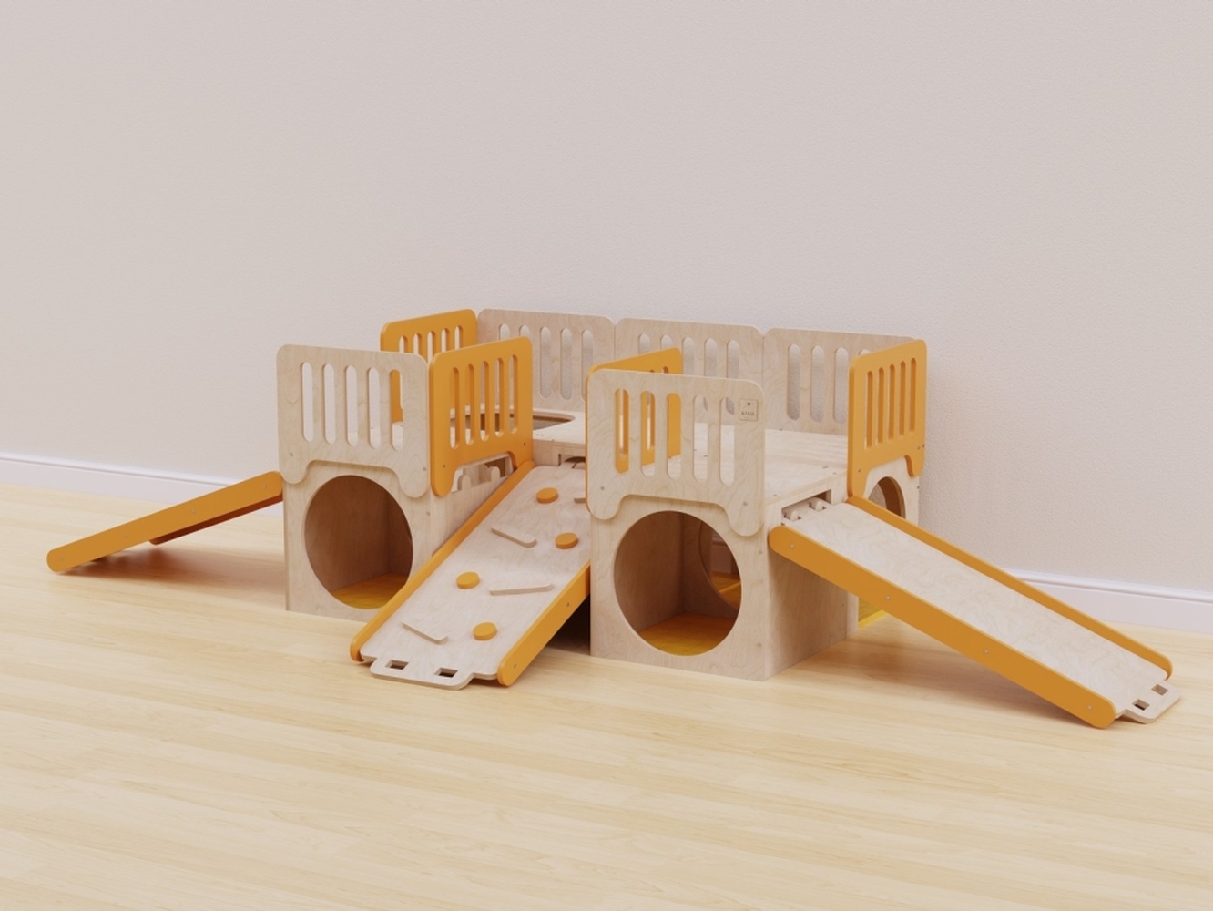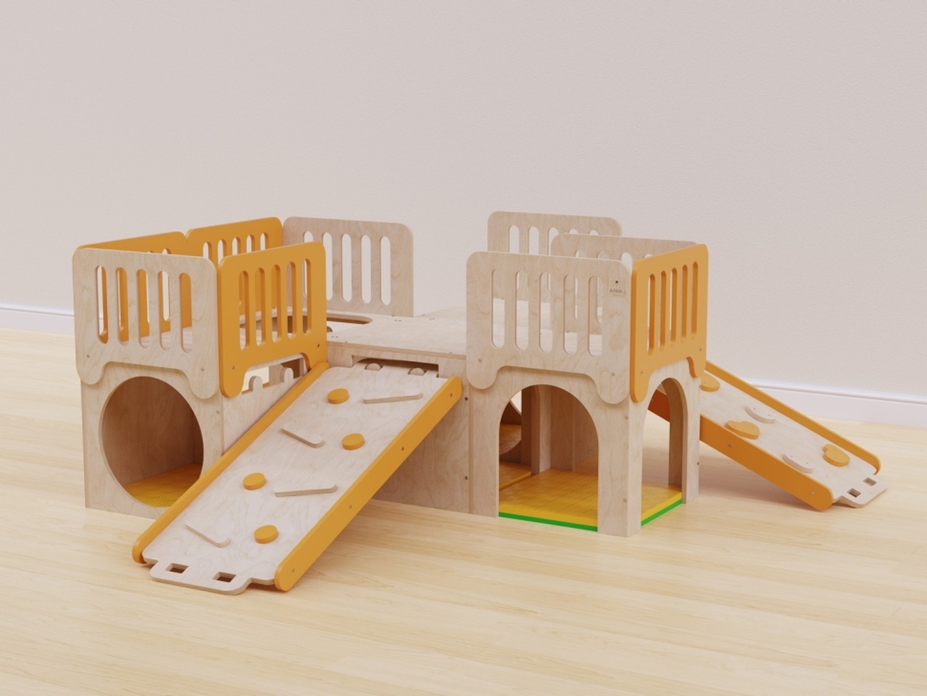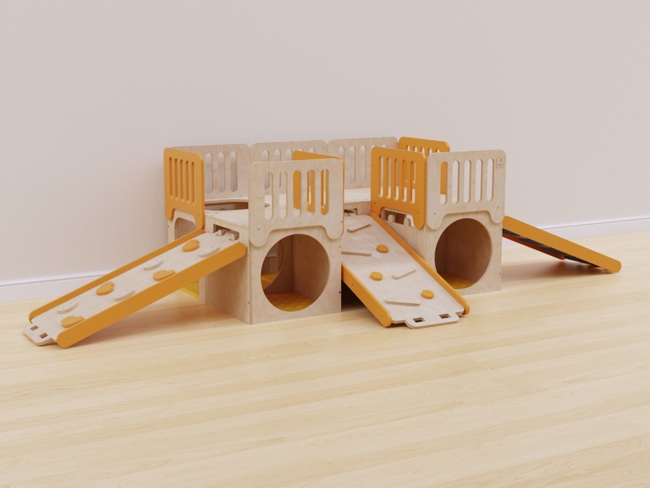 Каждый элемент конструкции соответствует актуальным ГОСТам на детскую мебель, требованиям СанПиН и пожарной безопасности, рекомендациям ФОП ДО по созданию развивающей среды для детей раннего возраста. Гладкие поверхности просты в уходе: достаточно влажной уборки для поддержания высокого уровня гигиены. Универсальный дизайн позволяет установить комплекс в любое пространство.